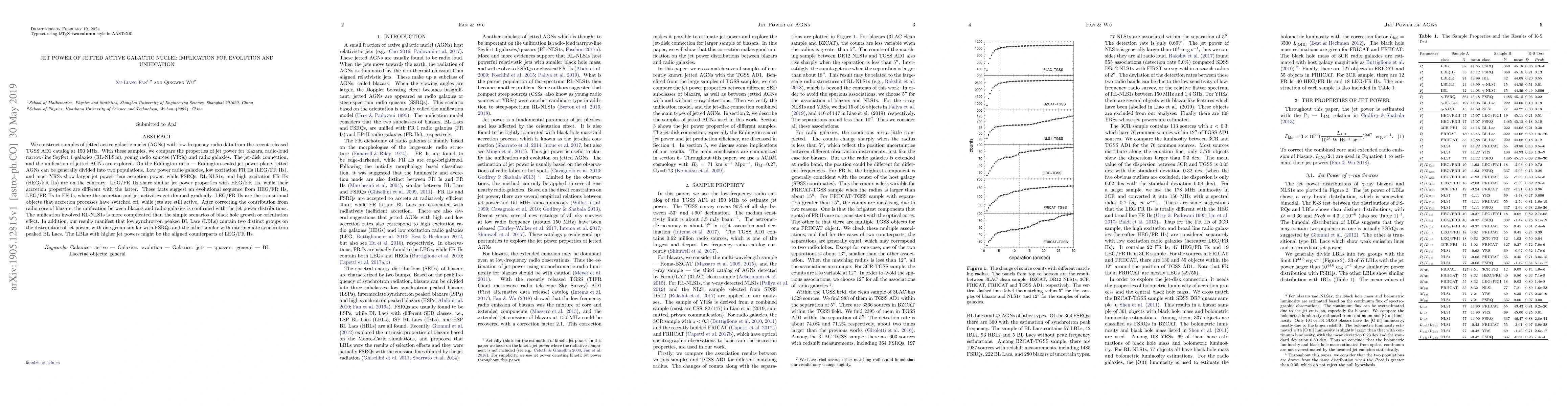 This paper examines the jet power of various jetted active galactic nuclei (AGNs) using low-frequency radio data, revealing two distinct populations on the Eddington ratio plane. It supports the unification of blazars and radio galaxies based on jet power, while highlighting the complex nature of radio-loud narrow-line Seyfert 1 galaxies (RL-NLS1s) and the evolutionary sequence from high to low excitation radio galaxies.