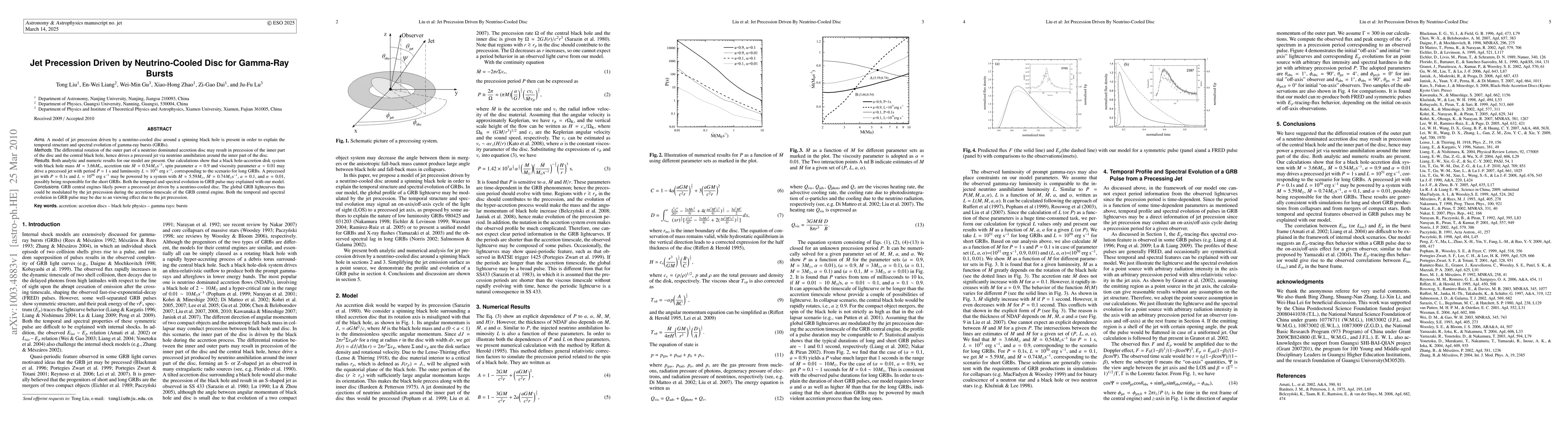 This paper proposes a model where jet precession, driven by a neutrino-cooled accretion disc around a spinning black hole, explains the temporal and spectral evolution of gamma-ray bursts (GRBs). The model suggests that differential rotation in the disc induces precession, leading to modulated GRB lightcurves and viewing effects.