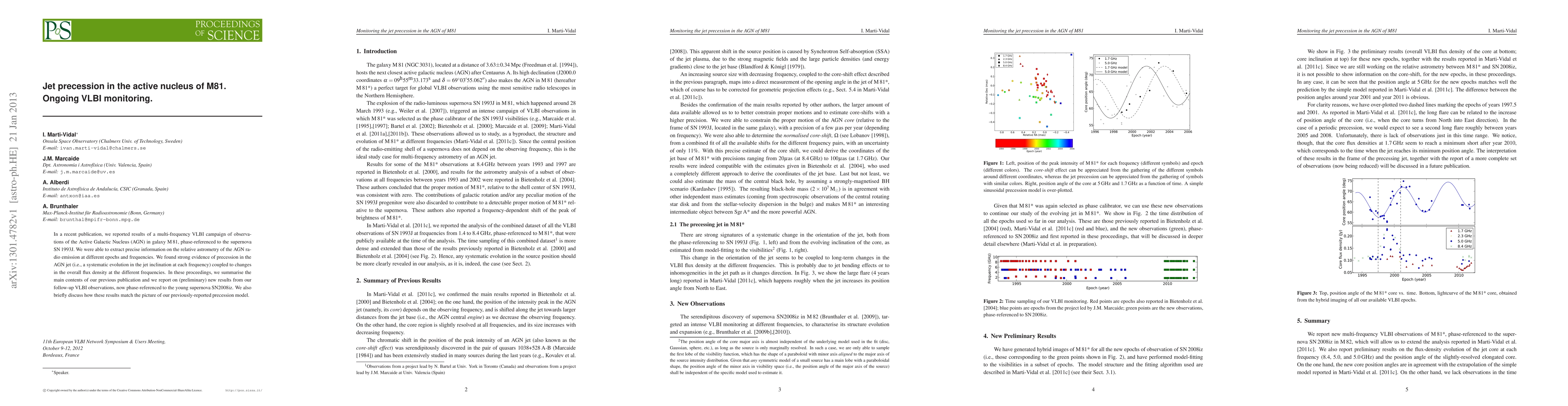 In a recent publication, we reported results of a multi-frequency VLBI campaign of observations of the Active Galactic Nucleus (AGN) in galaxy M\,81, phase-referenced to the supernova SN\,1993J. We were able to extract precise information on the relative astrometry of the AGN radio emission at different epochs and frequencies. We found strong evidence of precession in the AGN jet (i.e., a systematic evolution in the jet inclination at each frequency) coupled to changes in the overall flux density at the different frequencies. In these proceedings, we summarise the main contents of our previous publication and we report on (preliminary) new results from our follow-up VLBI observations, now phase-referenced to the young supernova SN2008iz. We also briefly discuss how these results match the picture of our previously-reported precession model.