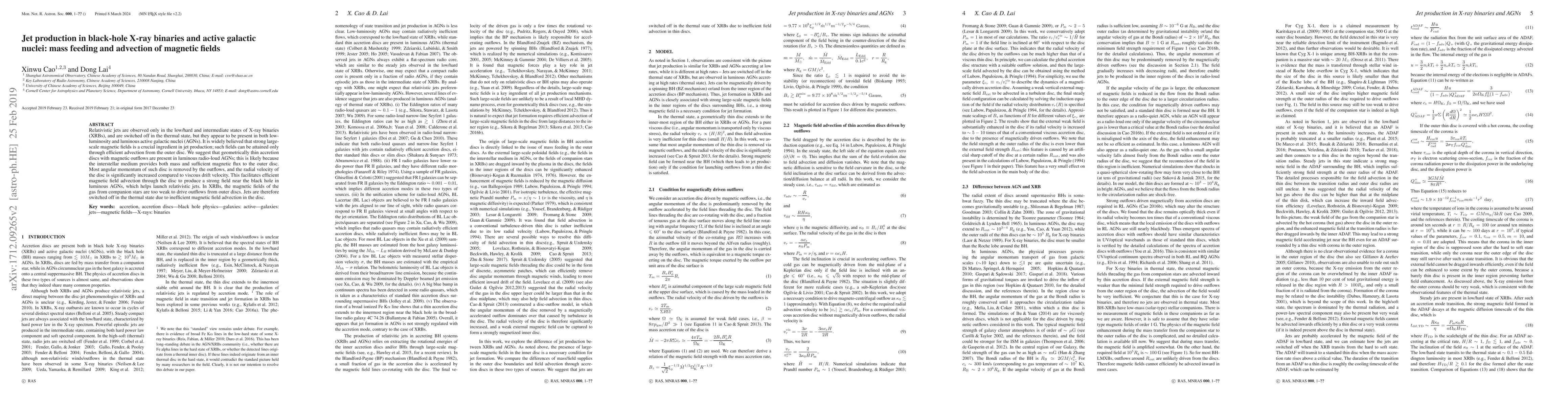 Relativistic jets are observed only in the low/hard and intermediate states of X-ray binaries (XRBs), and are switched off in the thermal state, but they appear to be present in both low-luminosity and luminous active galactic nuclei (AGNs). It is widely believed that strong large-scale magnetic fields is a crucial ingredient in jet production; such fields can be attained only through efficient advection from the outer disc. We suggest that geometrically thin accretion discs with magnetic outflows are present in luminous radio-loud AGNs; this is likely because the interstellar medium provides both mass and sufficient magnetic flux to the outer disc. Most angular momentum of such disc is removed by the outflows, and the radial velocity of the disc is significantly increased compared to viscous drift velocity. This facilitates efficient magnetic field advection through the disc to produce a strong field near the black hole in luminous AGNs, which helps launch relativistic jets. In XRBs, the magnetic fields of the gas from companion stars are too weak to drive outflows from outer discs. Jets are therefore switched off in the thermal state due to inefficient magnetic field advection in the disc.