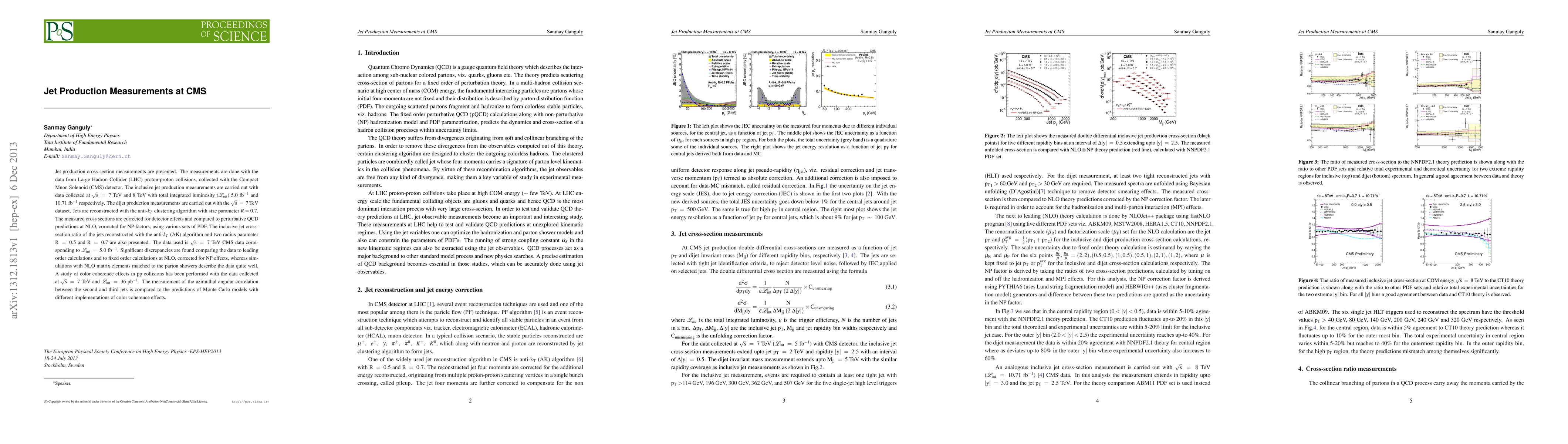 Jet production cross-section measurements are presented. The measurements are done with the data from Large Hadron Collider (LHC) proton-proton collisions, collected with the Compact Muon Solenoid (CMS) detector. The inclusive jet production measurements are carried out with data collected $\rm \sqrt{s} ~= ~7 ~TeV$ and $\rm 8~TeV$ with total integrated luminosity ($\mathcal{L}_{int}$) $\rm 5.0~ fb^{-1}$ and $\rm 10.71~ fb^{-1}$ respectively. The dijet production measurements are carried out with the $\rm \sqrt{s}~ =~ 7 ~TeV$ dataset. Jets are reconstructed with the anti-$k_T$ clustering algorithm with size parameter $R=0.7$. The measured cross sections are corrected for detector effects and compared to perturbative QCD predictions at NLO, corrected for NP factors, using various sets of PDF. The inclusive jet cross-section ratio of the jets reconstructed with the anti-$k_T$ (AK) algorithm and two radius parameter $\rm R~=~0.5$ and $\rm R~=~0.7$ are also presented. The data used is $\rm \sqrt{s}~ =~ 7 ~TeV$ CMS data corresponding to $\rm \mathcal{L}_{int}~=~5.0 ~fb^{-1}$. Significant discrepancies are found comparing the data to leading order calculations and to fixed order calculations at NLO, corrected for NP effects, whereas simulations with NLO matrix elements matched to the parton showers describe the data quite well. A study of color coherence effects in pp collisions has been performed with the data collected at $\rm \sqrt{s}~ =~ 7~TeV$ and $\rm\mathcal{L}_{int}~=~ 36~pb^{-1}$. The measurement of the azimuthal angular correlation between the second and third jets is compared to the predictions of Monte Carlo models with different implementations of color coherence effects.