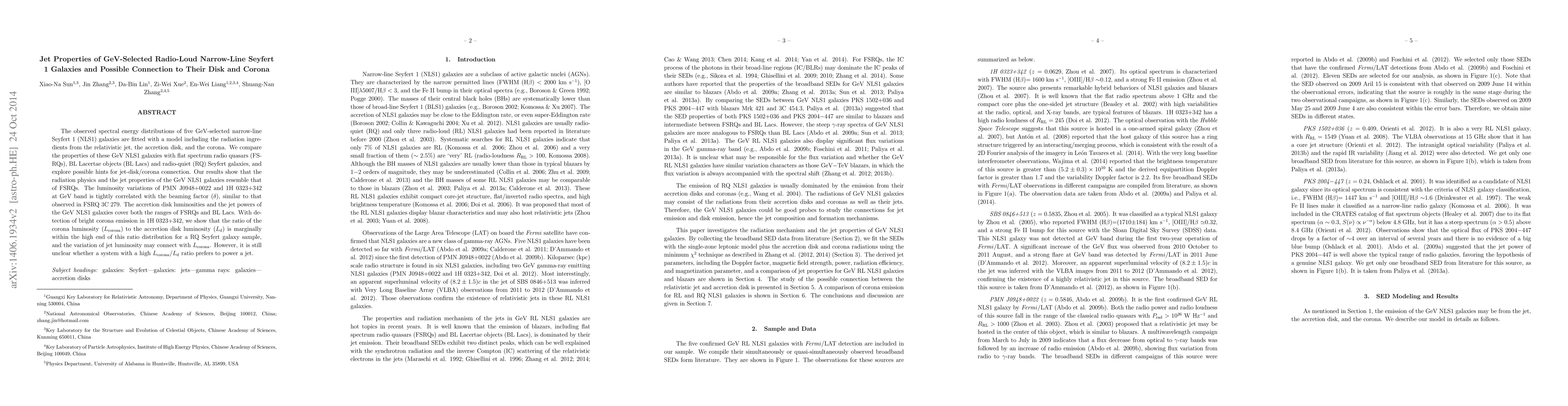 Research on GeV-selected radio-loud NLS1 galaxies reveals similarities with FSRQs in terms of jet properties and radiation physics, suggesting a connection between the disk, corona, and jet, but the exact relationship remains unclear.