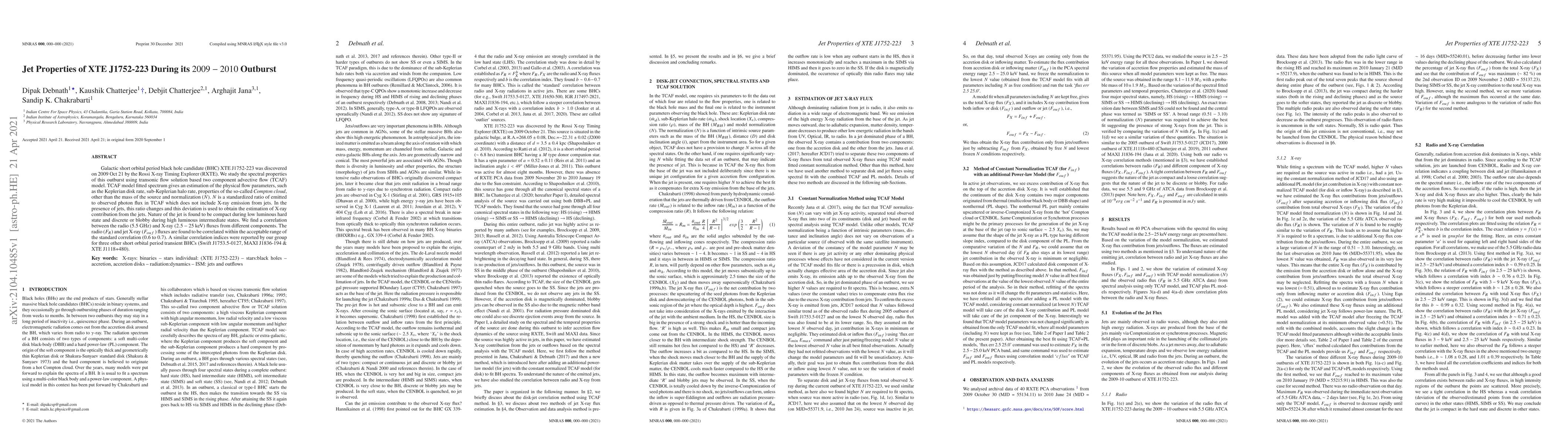 This study analyzes the 2009-2010 outburst of black hole candidate XTE J1752-223 using spectral modeling to estimate flow and jet properties, revealing a transition from compact to blob-like jets. It also finds a consistent correlation between radio and X-ray emissions, similar to other transient black hole systems.