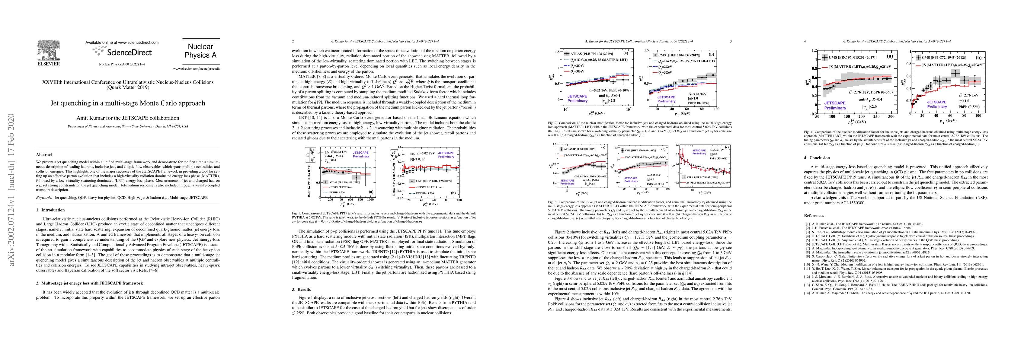 We present a jet quenching model within a unified multi-stage framework and demonstrate for the first time a simultaneous description of leading hadrons, inclusive jets, and elliptic flow observables which spans multiple centralities and collision energies. This highlights one of the major successes of the JETSCAPE framework in providing a tool for setting up an effective parton evolution that includes a high-virtuality radiation dominated energy loss phase (MATTER), followed by a low-virtuality scattering dominated (LBT) energy loss phase. Measurements of jet and charged-hadron $R_{AA}$ set strong constraints on the jet quenching model. Jet-medium response is also included through a weakly-coupled transport description.