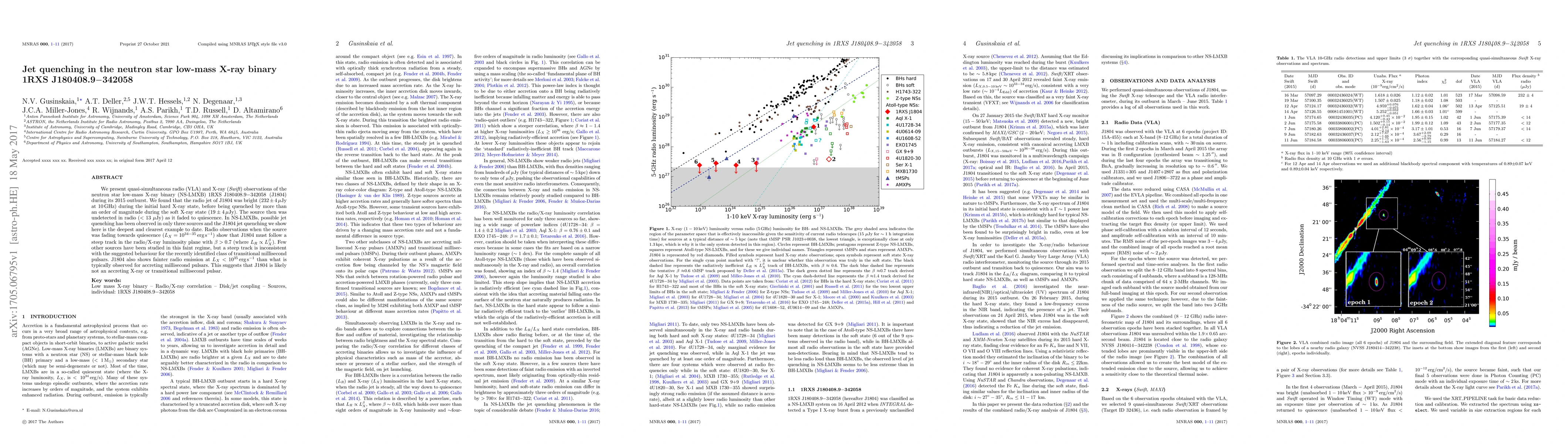 We present quasi-simultaneous radio (VLA) and X-ray ($Swift$) observations of the neutron star low-mass X-ray binary (NS-LMXB) 1RXS J180408.9$-$342058 (J1804) during its 2015 outburst. We found that the radio jet of J1804 was bright ($232 \pm 4 \mu$Jy at $10$ GHz) during the initial hard X-ray state, before being quenched by more than an order of magnitude during the soft X-ray state ($19 \pm 4 \mu$Jy). The source then was undetected in radio (< $13 \mu$Jy) as it faded to quiescence. In NS-LMXBs, possible jet quenching has been observed in only three sources and the J1804 jet quenching we show here is the deepest and clearest example to date. Radio observations when the source was fading towards quiescence ($L_X = 10^{34-35}$ erg s$^{-1}$) show that J1804 must follow a steep track in the radio/X-ray luminosity plane with $\beta > 0.7$ (where $L_R \propto L_X^{\beta}$). Few other sources have been studied in this faint regime, but a steep track is inconsistent with the suggested behaviour for the recently identified class of transitional millisecond pulsars. J1804 also shows fainter radio emission at $L_X < 10^{35}$ erg s$^{-1}$ than what is typically observed for accreting millisecond pulsars. This suggests that J1804 is likely not an accreting X-ray or transitional millisecond pulsar.
