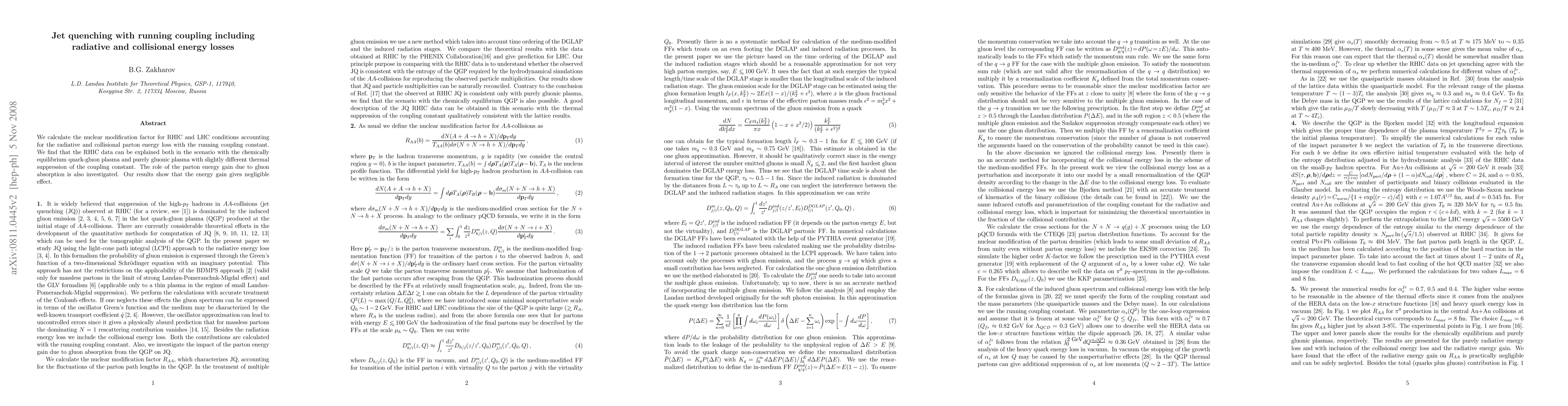 We calculate the nuclear modification factor for RHIC and LHC conditions accounting for the radiative and collisional parton energy loss with the running coupling constant.We find that the RHIC data can be explained both in the scenario with the chemically equilibrium quark-gluon plasma and purely gluonic plasma with slightly different thermal suppression of the coupling constant. The role of the parton energy gain due to gluon absorption is also investigated. Our results show that the energy gain gives negligible effect.