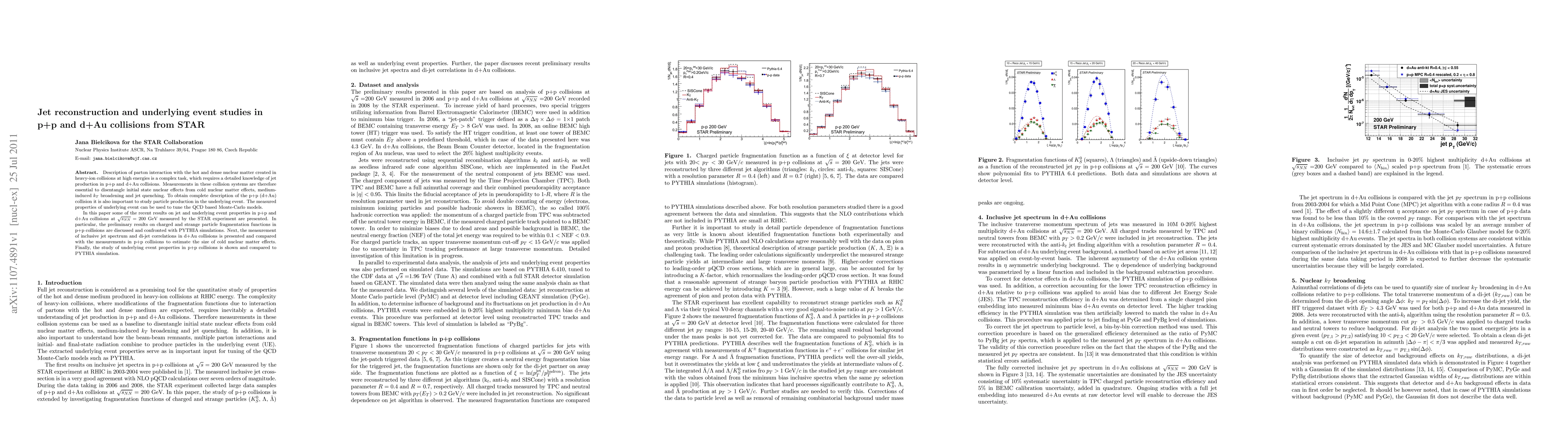 This paper presents STAR experiment results on jet reconstruction and underlying event studies in p+p and d+Au collisions at 200 GeV, aiming to disentangle nuclear effects and jet quenching. It compares preliminary results on fragmentation functions in p+p collisions with PYTHIA simulations and analyzes jet spectra and correlations in d+Au collisions to assess cold nuclear matter effects.