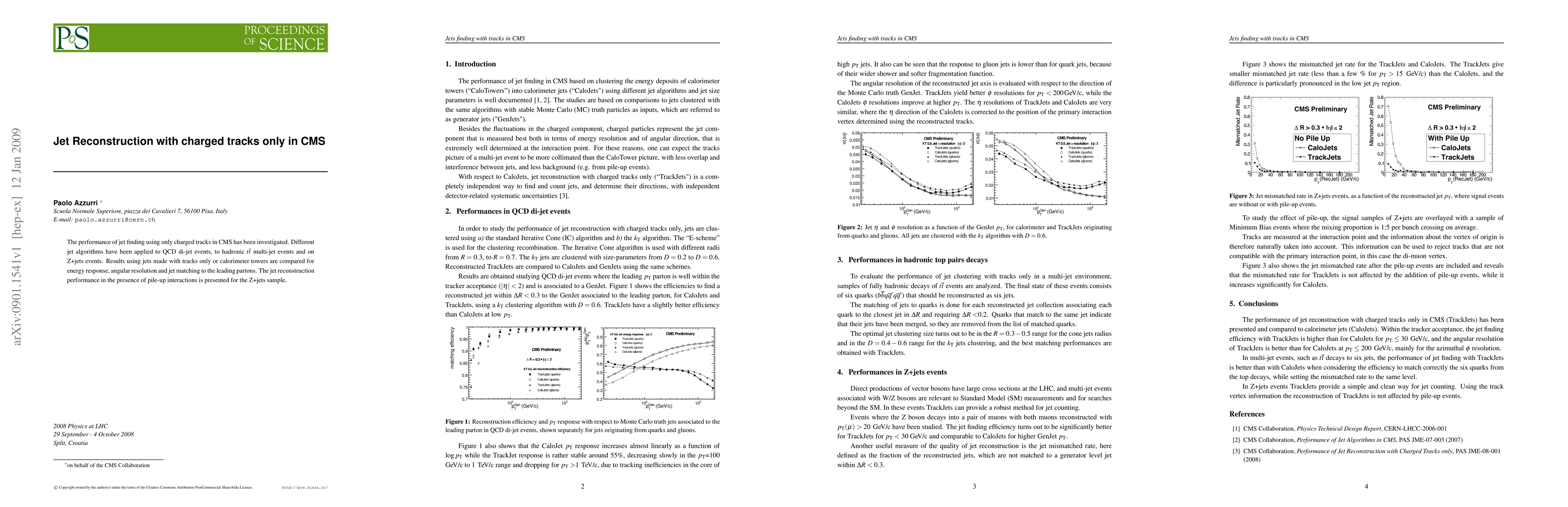 The paper presents a detailed analysis of jet reconstruction using charged tracks only in CMS, comparing its performance to calorimeter jets in various event types, including QCD di-jet, hadronic top, and Z+jets events.
