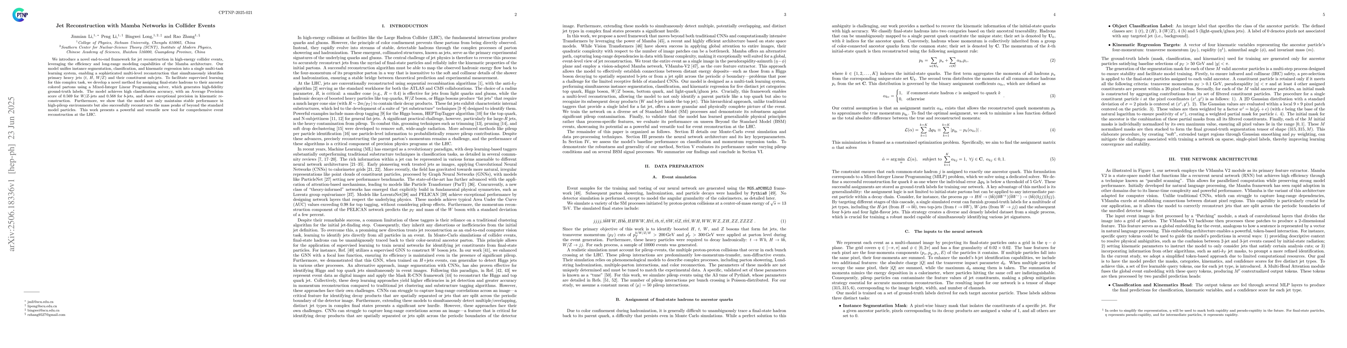 We introduce a novel end-to-end framework for jet reconstruction in high-energy collider events, leveraging the efficiency and long-range modeling capabilities of the Mamba architecture. Our model unifies instance segmentation, classification, and kinematic regression into a single multi-task learning system, enabling a sophisticated multi-level reconstruction that simultaneously identifies primary heavy jets ($t$, $H$, $W/Z$) and their constituent sub-jets. To facilitate supervised learning for this complex task, we develop a novel method for assigning final-state hadrons to their ancestor colored partons using a Mixed-Integer Linear Programming solver, which generates high-fidelity ground-truth labels. The model achieves high classification accuracy, with an Average Precision score of 0.569 for $W/Z$-jets and 0.568 for $b$-jets, and shows exceptional precision in kinematic reconstruction. Furthermore, we show that the model not only maintains stable performance in high-pileup environments but also successfully reconstructs the mass peaks of beyond the standard model particles. This work presents a powerful and versatile new tool for comprehensive event reconstruction at the LHC.