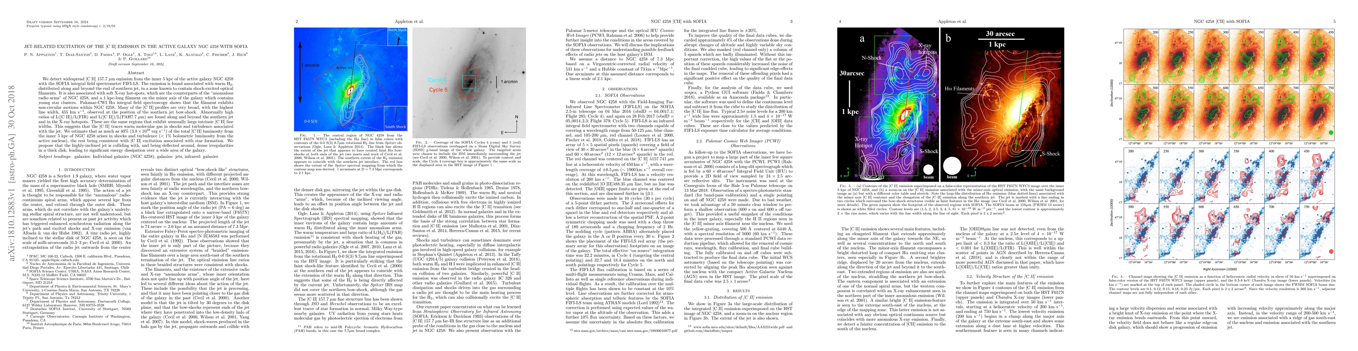 This study detects widespread [CII] emission in the active galaxy NGC 4258, primarily associated with shocks and turbulence from the jet, suggesting that up to 40% of the [CII] luminosity arises from jet-related excitation. The jet's interaction with the galaxy's thick disk causes significant energy dissipation.