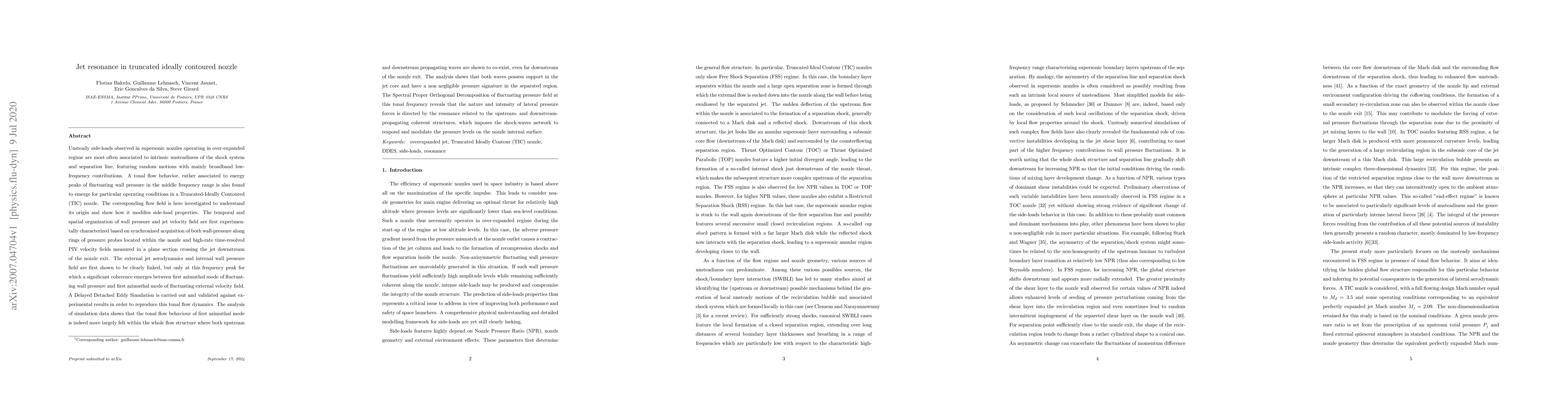 An overexpanded jet in a truncated ideally contoured nozzle is found to feature a tonal behavior. The flow field is investigated to understand its origin and show how it modifies side-load properties. The temporal and spatial organization of wall pressure and jet velocity field are first experimentally characterized based on synchronized acquisition of both wall-pressure along rings of pressure probes located within the nozzle and high-rate time-resolved PIV velocity fields measured in a plane section crossing the jet downstream of the nozzle exit. The external jet aerodynamics and internal wall pressure field are first shown to be clearly linked, but only at this frequency peak for which a significant coherence emerges between first azimuthal mode of fluctuating wall pressure and first azimuthal mode of fluctuating external velocity field. A Delayed Detached Eddy Simulation is carried out and validated against experimental results in order to reproduce this tonal flow dynamics. The analysis of simulation data shows that the tonal flow behaviour of first azimuthal mode is indeed more largely felt within the whole flow structure where both upstream and downstream propagating waves are shown to co-exist, even far downstream of the nozzle exit. The analysis shows that both waves possess support in the jet core and have a non negligible pressure signature in the separated region. The Spectral Proper Orthogonal Decomposition of fluctuating pressure field at this tonal frequency reveals that the nature and intensity of lateral pressure forces is directed by the resonance related to the upstream- and downstream-propagating coherent structures, which imposes the shock-waves network to respond and modulate the pressure levels on the nozzle internal surface.