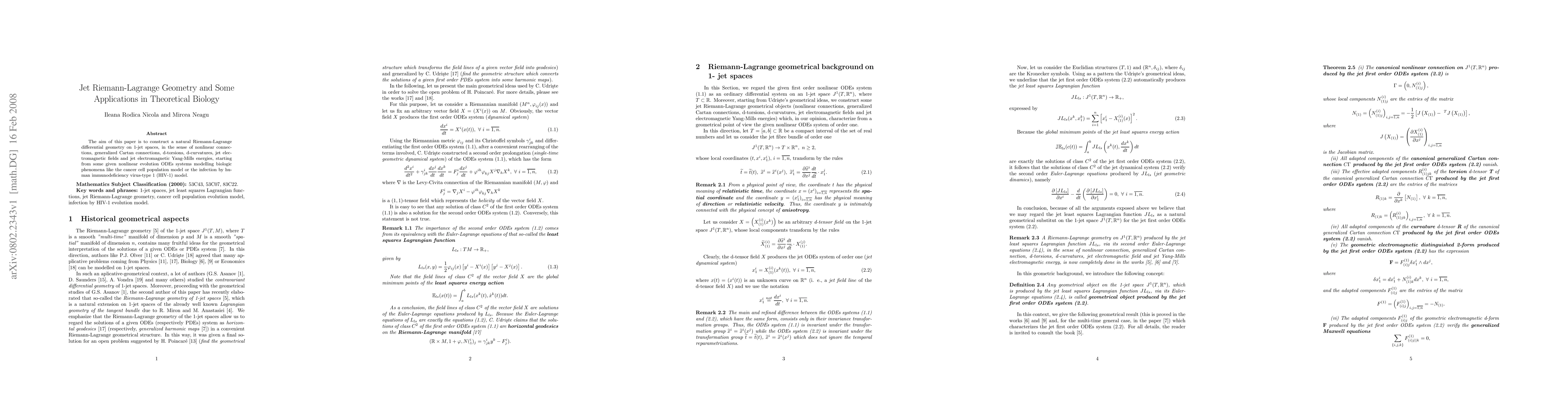This paper develops a Riemann-Lagrange differential geometry on 1-jet spaces, incorporating nonlinear connections and generalized Cartan connections, to model biological phenomena such as cancer cell populations and HIV-1 infections through jet electromagnetic fields and Yang-Mills energies.