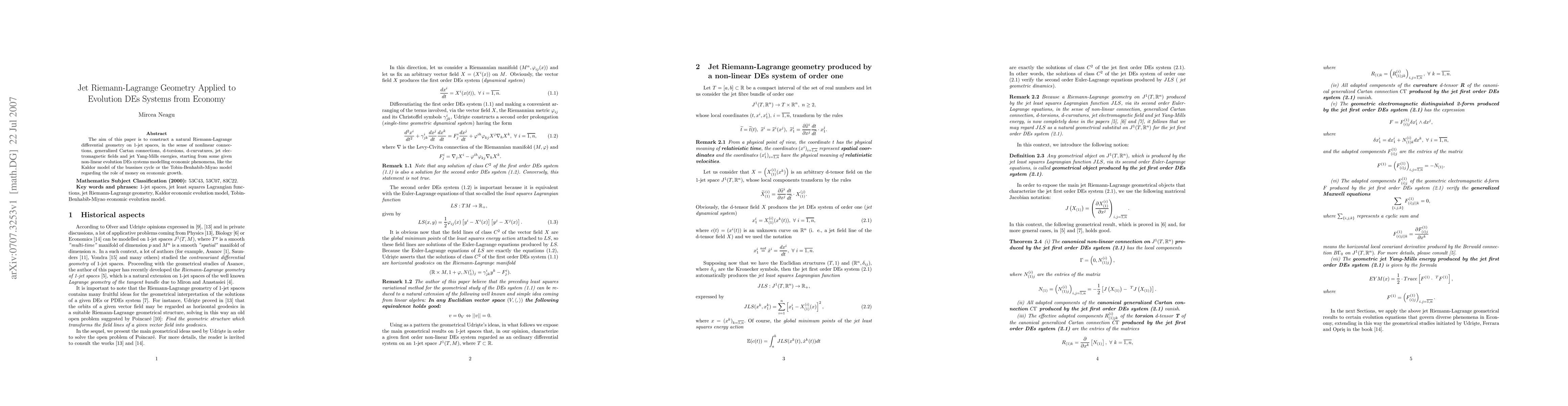 The aim of this paper is to construct a natural Riemann-Lagrange differential geometry on 1-jet spaces, in the sense of nonlinear connections, generalized Cartan connections, d-torsions, d-curvatures, jet electromagnetic fields and jet Yang-Mills energies, starting from some given non-linear evolution DEs systems modelling economic phenomena, like the Kaldor model of the bussines cycle or the Tobin-Benhabib-Miyao model regarding the role of money on economic growth.