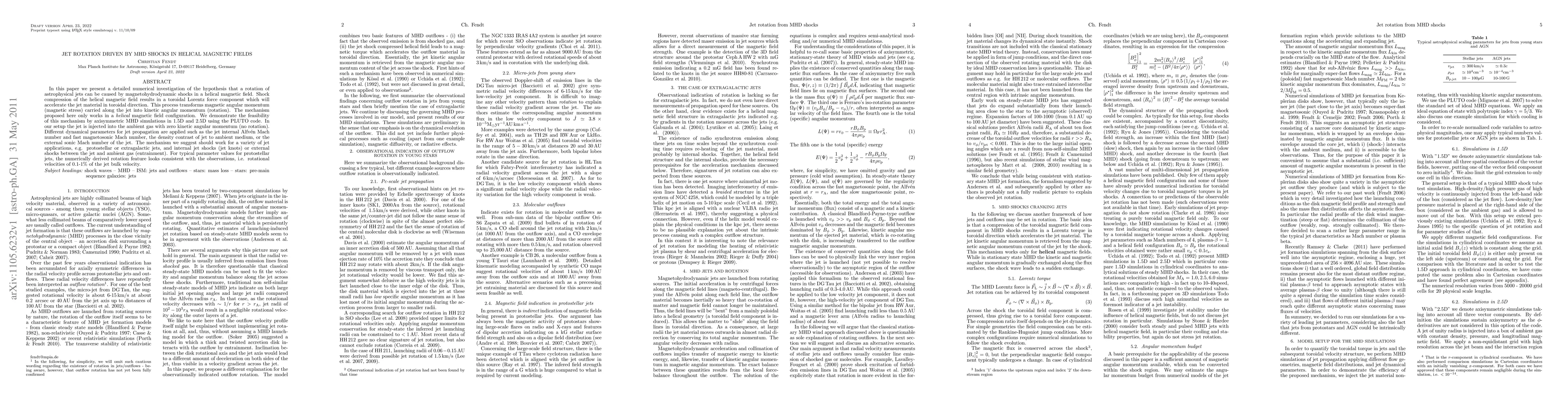 This paper investigates numerically the mechanism by which magnetohydrodynamic shocks in helical magnetic fields can drive the rotation of astrophysical jets. The study shows that shock compression transforms magnetic angular momentum into kinetic angular momentum, leading to jet rotation, and supports the hypothesis through axisymmetric MHD simulations.