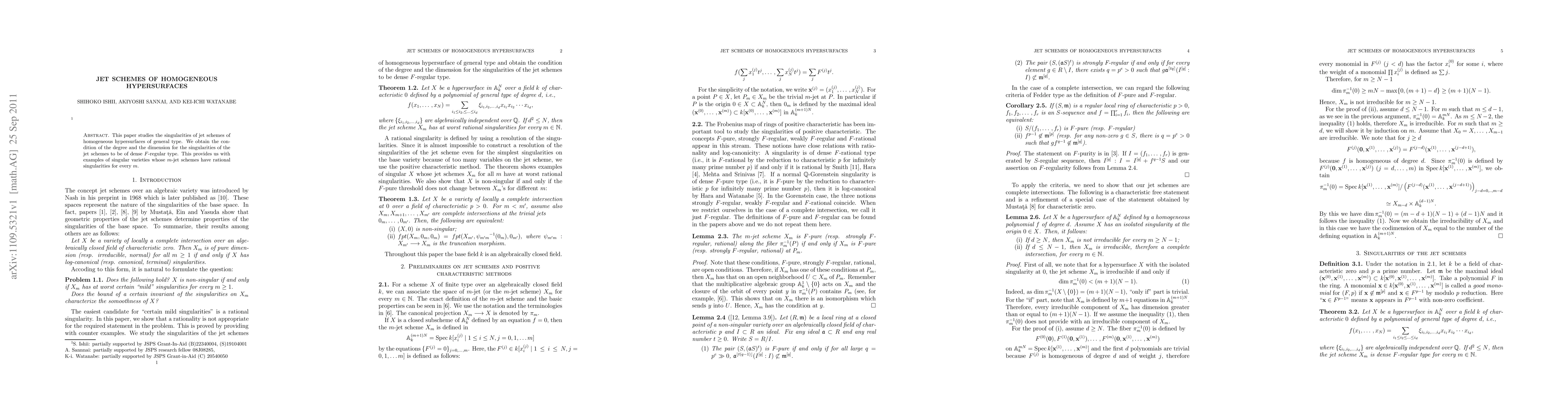 This paper investigates the singularities of jet schemes for homogeneous hypersurfaces of general type, establishing conditions on degree and dimension for these singularities to be of dense $F$-regular type. It also provides examples of singular varieties with rational singularities in their $m$-jet schemes for all $m$.
