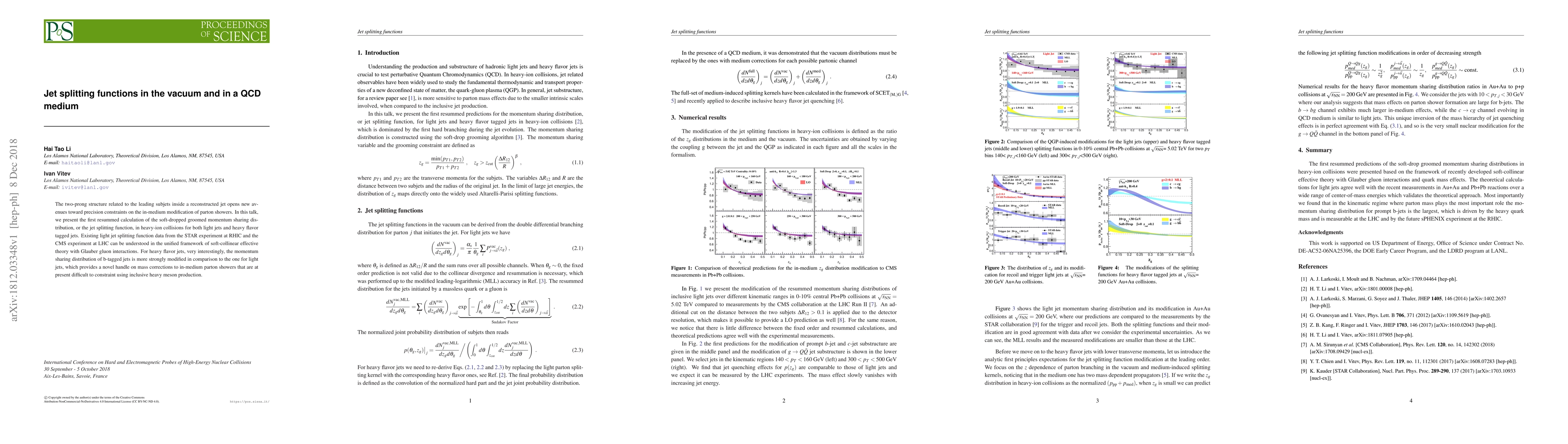 The two-prong structure related to the leading subjets inside a reconstructed jet opens new avenues toward precision constraints on the in-medium modification of parton showers. In this talk, we present the first resummed calculation of the soft-dropped groomed momentum sharing distribution, or the jet splitting function, in heavy-ion collisions for both light jets and heavy flavor tagged jets. Existing light jet splitting function data from the STAR experiment at RHIC and the CMS experiment at LHC can be understood in the unified framework of soft-collinear effective theory with Glauber gluon interactions. For heavy flavor jets, very interestingly, the momentum sharing distribution of b-tagged jets is more strongly modified in comparison to the one for light jets, which provides a novel handle on mass corrections to in-medium parton showers that are at present difficult to constraint using inclusive heavy meson production.