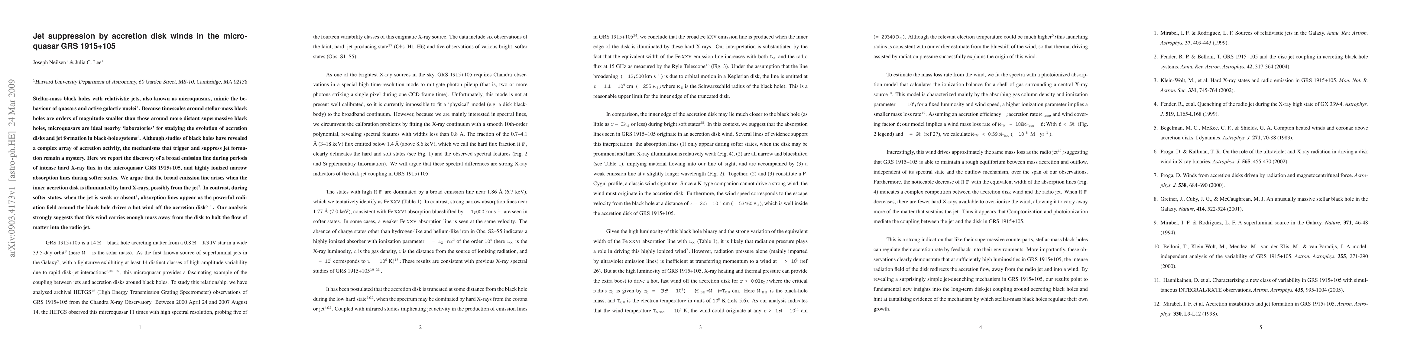 Stellar-mass black holes with relativistic jets, also known as microquasars, mimic the behavior of quasars and active galactic nuclei. Because timescales around stellar-mass black holes are orders of magnitude smaller than those around more distant supermassive black holes, microquasars are ideal nearby `laboratories' for studying the evolution of accretion disks and jet formation in black-hole systems. Although studies of black holes have revealed a complex array of accretion activity, the mechanisms that trigger and suppress jet formation remain a mystery. Here we report the discovery of a broad emission line during periods of intense hard X-ray flux in the microquasar GRS 1915+105, and highly ionized narrow absorption lines during softer states. We argue that the broad emission line arises when the inner accretion disk is illuminated by hard X-rays, possibly from the jet. In contrast, during softer states, when the jet is weak or absent, absorption lines appear as the powerful radiation field around the black hole drives a hot wind off the accretion disk. Our analysis strongly suggests that this wind carries enough mass away from the disk to halt the flow of matter into the radio jet.