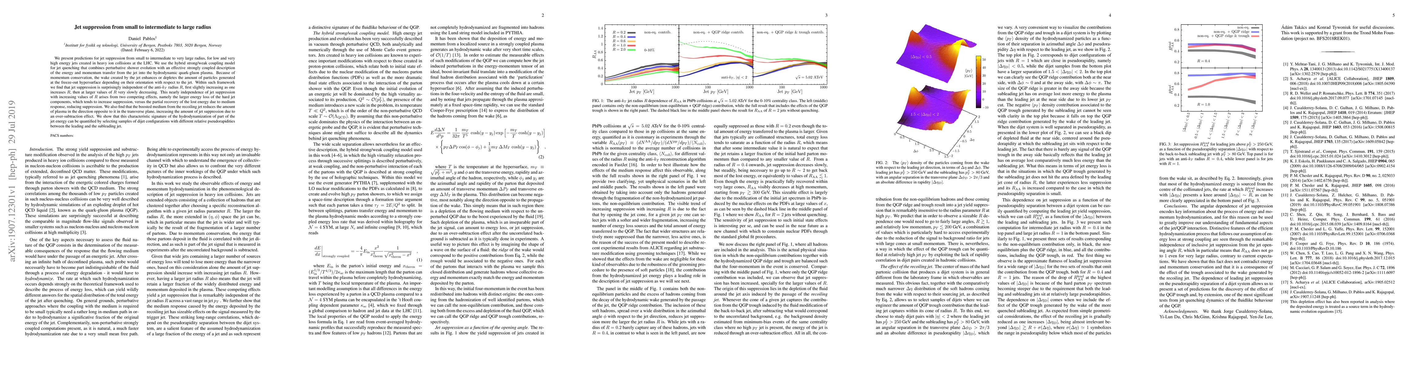 We present predictions for jet suppression from small to intermediate to very large radius, for low and very high energy jets created in heavy ion collisions at the LHC. We use the hybrid strong/weak coupling model for jet quenching that combines perturbative shower evolution with an effective strongly coupled description of the energy and momentum transfer from the jet into the hydrodynamic quark-gluon plasma. Because of momentum conservation, the wake created by the jet enhances or depletes the amount of particles generated at the freeze-out hypersurface depending on their orientation with respect to the jet. Within such framework we find that jet suppression is surprisingly independent of the anti-$k_T$ radius $R$, first slightly increasing as one increases $R$, then at larger values of $R$ very slowly decreasing. This nearly independence of jet suppression with increasing values of $R$ arises from two competing effects, namely the larger energy loss of the hard jet components, which tends to increase suppression, versus the partial recovery of the lost energy due to medium response, reducing suppression. We also find that the boosted medium from the recoiling jet reduces the amount of plasma in the direction opposite to it in the transverse plane, increasing the amount of jet suppression due to an over-subtraction effect. We show that this characteristic signature of the hydrodynamization of part of the jet energy can be quantified by selecting samples of dijet configurations with different relative pseudorapidities between the leading and the subleading jet.