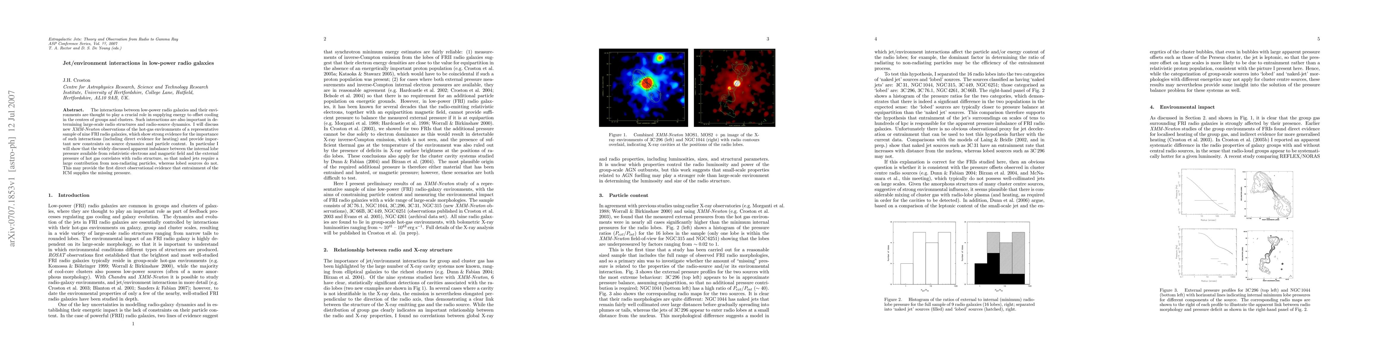 The interactions between low-power radio galaxies and their environments are thought to play a crucial role in supplying energy to offset cooling in the centres of groups and clusters. Such interactions are also important in determining large-scale radio structures and radio-source dynamics. I will discuss new XMM-Newton observations of the hot-gas environments of a representative sample of nine FRI radio galaxies, which show strong evidence for the importance of such interactions (including evidence for heating) and provide important new constraints on source dynamics and particle content. In particular I will show that the widely discussed apparent imbalance between the internal lobe pressure available from relativistic electrons and magnetic field and the external pressure of hot gas correlates with radio structure, so that naked jets require a large contribution from non-radiating particles, whereas lobed sources do not. This may provide the first direct observational evidence that entrainment of the ICM supplies the missing pressure.