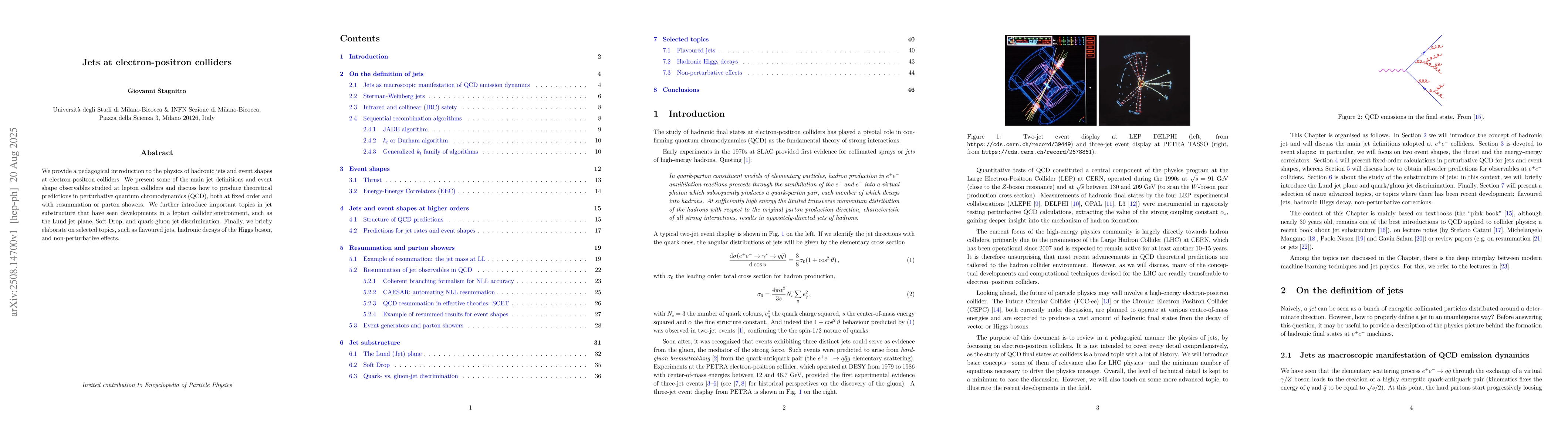 The research provides a pedagogical introduction to jet physics and event shapes at electron-positron colliders, discussing theoretical predictions in perturbative QCD, resummation techniques, and jet substructure topics like the Lund jet plane, Soft Drop, and quark-gluon jet discrimination.