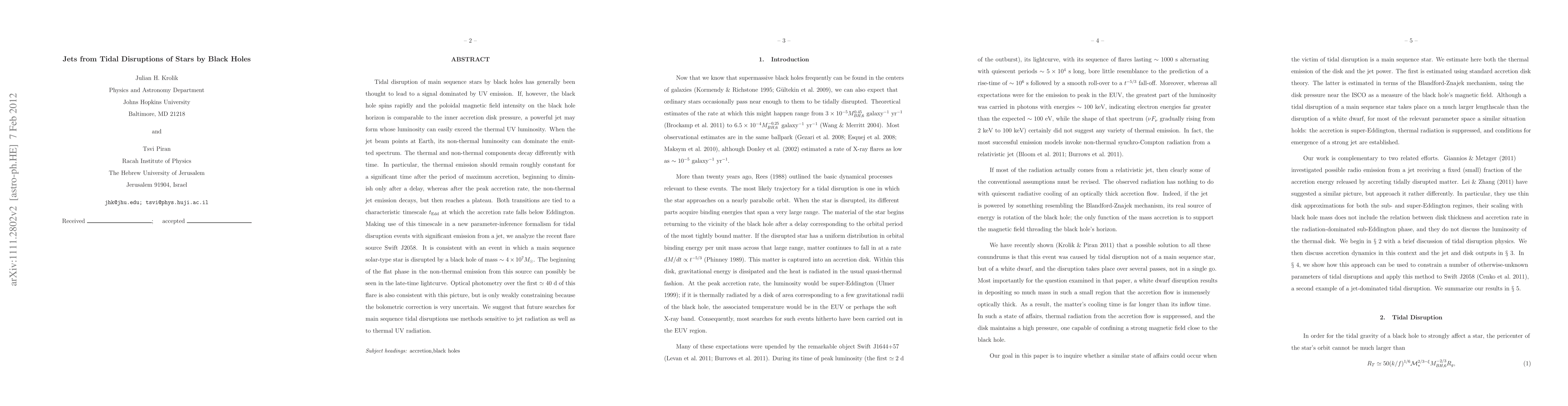 Tidal disruption of main sequence stars by black holes has generally been thought to lead to a signal dominated by UV emission. If, however, the black hole spins rapidly and the poloidal magnetic field intensity on the black hole horizon is comparable to the inner accretion disk pressure, a powerful jet may form whose luminosity can easily exceed the thermal UV luminosity. When the jet beam points at Earth, its non-thermal luminosity can dominate the emitted spectrum. The thermal and non-thermal components decay differently with time. In particular, the thermal emission should remain roughly constant for a significant time after the period of maximum accretion, beginning to diminish only after a delay, whereas after the peak accretion rate, the non-thermal jet emission decays, but then reaches a plateau. Both transitions are tied to a characteristic timescale $t_{\rm Edd}$ at which the accretion rate falls below Eddington. Making use of this timescale in a new parameter-inference formalism for tidal disruption events with significant emission from a jet, we analyze the recent flare source Swift J2058. It is consistent with an event in which a main sequence solar-type staris disrupted by a black hole of mass $\sim 4 \times 10^7 M_{\odot}$. The beginning of the flat phase in the non-thermal emission from this source can possibly be seen in the late-time lightcurve. Optical photometry over the first $\simeq 40$ d of this flare is also consistent with this picture, but is only weakly constraining because the bolometric correction is very uncertain. We suggest that future searches for main sequence tidal disruptions use methods sensitive to jet radiation as well as to thermal UV radiation.