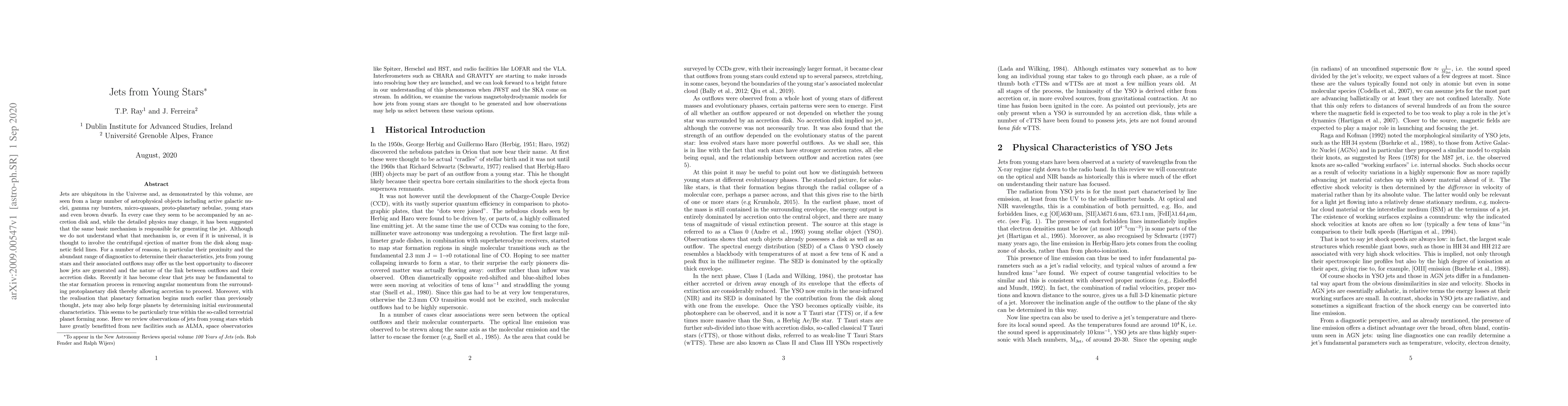 Jets are ubiquitous in the Universe and, as demonstrated in this volume, are seen from a large number of astrophysical objects. For a number of reasons, in particular their proximity and the abundant range of diagnostics to determine their characteristics, jets from young stars and their associated outflows may offer us the best opportunity to discover how jets are generated in general and the nature of the link between outflows and their accretion disks. Recently it has become clear that jets may be fundamental to the star formation process in removing angular momentum from the surrounding protoplanetary disk thereby allowing accretion to proceed. Moreover, with the realisation that planetary formation begins much earlier than previously thought, jets may also help forge planets by determining initial environmental characteristics. This seems to be particularly true within the so-called terrestrial planet forming zone. Here we review observations of jets from young stars which have greatly benefitted from new facilities such as ALMA, space observatories like Spitzer, Herschel and HST, and radio facilities like LOFAR and the VLA. Interferometers such as CHARA and GRAVITY are starting to make inroads into resolving how they are launched, and we can look forward to a bright future in our understanding of this phenomenon when JWST and the SKA come on stream. In addition, we examine the various magnetohydrodynamic models for how jets from young stars are thought to be generated and how observations may help us select between these various options.