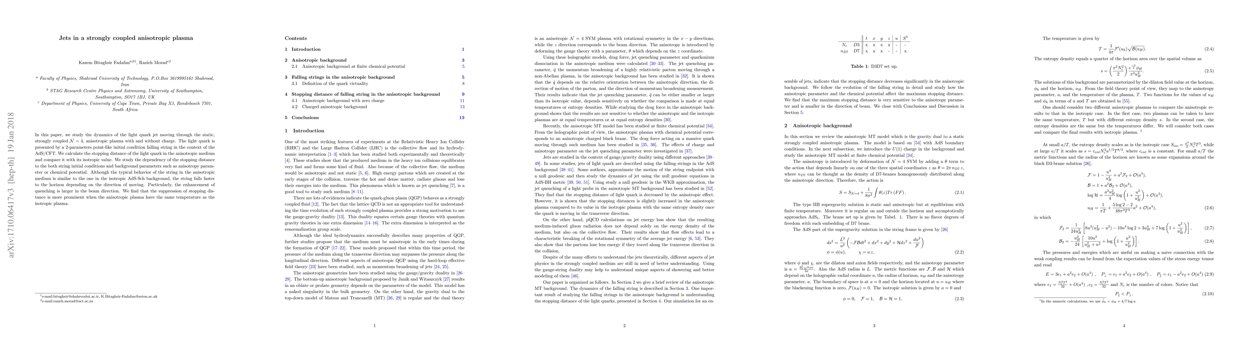 In this paper, we study the dynamics of the light quark jet moving through the static, strongly coupled $\mathcal{N}=4$, anisotropic plasma with and without charge. The light quark is presented by a point-like initial condition falling string in the context of the AdS/CFT. We calculate the stopping distance of the light quark in the anisotropic medium and compare it with its isotropic value. By studying the falling string in the beam direction and transverse direction, we find that the jet quenching increases in both directions. Although, the enhancement of quenching is larger in the beam direction. Also, the suppression of stopping distance is more prominent when the anisotropic plasma have the same temperature as the isotropic plasma.