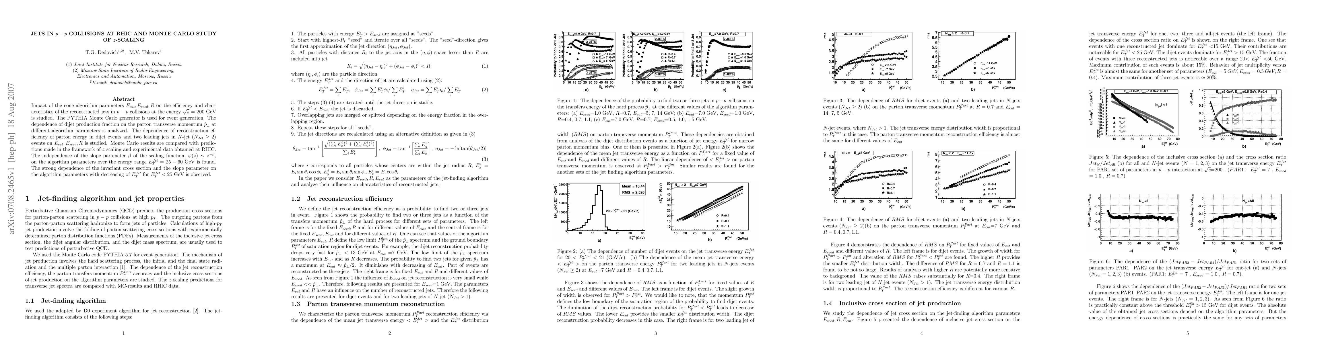 Impact of the cone algorithm parameters Ecut, Eseed, R on the efficiency and characteristics of the reconstructed jets in p-p collisions at the energy sqrt s = 200 GeV is studied. The PYTHIA Monte Carlo generator is used for event generation. The dependence of dijet production fraction on the parton transverse momentum at different algorithm parameters is analyzed. The dependence of reconstruction efficiency of parton energy in dijet events and two leading jets in N-jet events on Ecut, Eseed, R is studied. Monte Carlo results are compared with predictions made in the framework of z-scaling and experimental data obtained at RHIC. The independence of the slope parameter beta of the scaling function, on the algorithm parameters over the energy range ETJet=25-60 GeV is found. The strong dependence of the invariant cross section and the slope parameter on the algorithm parameters with decreasing of ETJet for ETJet<25 GeV is observed.