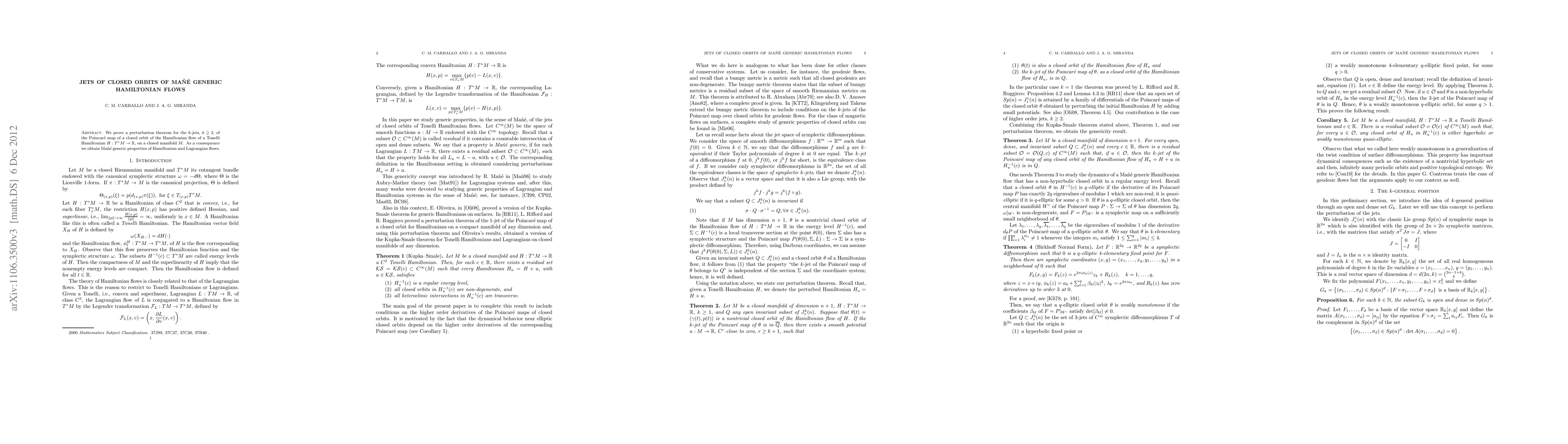 We prove a perturbation theorem for the $k$-jets, $k\geq 2$, of the Poincar\'e map of a closed orbit of the Hamiltonian flow of a Tonelli Hamiltonian $H: T^*M\to \R$, on a closed manifold $M$. As a consequence we obtain Ma\~n\'e generic properties of Hamiltonian and Lagrangian flows.