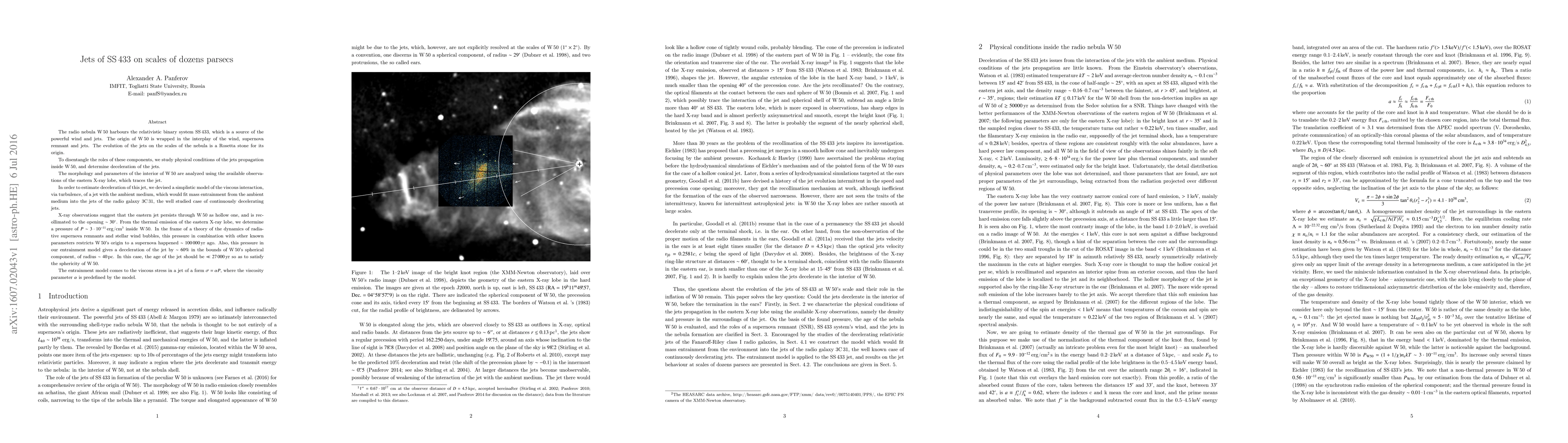 The radio nebula W50 harbours the relativistic binary system SS433, which is a source of the powerful wind and jets. The origin of W50 is wrapped in the interplay of the wind, supernova remnant and jets. The evolution of the jets on the scales of the nebula is a Rosetta stone for its origin. To disentangle the roles of these components, we study physical conditions of the jets propagation inside W50, and determine deceleration of the jets. The morphology and parameters of the interior of W50 are analyzed using the available observations of the eastern X-ray lobe, which traces the jet. In order to estimate deceleration of this jet, we devised a simplistic model of the viscous interaction, via turbulence, of a jet with the ambient medium, which would fit mass entrainment from the ambient medium into the jets of the radio galaxy 3C31, the well studied case of continuously decelerating jets. X-ray observations suggest that the eastern jet persists through W50 as hollow one, and is recollimated to the opening $\sim 30^\circ$. From the thermal emission of the eastern X-ray lobe, we determine a pressure of $P \sim 3\cdot 10^{-11}$ erg/cm$^3$ inside W50. In the frame of a theory of the dynamics of radiative supernova remnants and stellar wind bubbles, this pressure in combination with other known parameters restricts W50's origin to a supernova happened $\sim 100\,000$ yr ago. Also, this pressure in our entrainment model gives a deceleration of the jet by $\sim 60\%$ in the bounds of W50's spherical component, of radius $\sim 40$ pc. In this case, the age of the jet should be $\ll 27\,000$ yr so as to satisfy the sphericity of W50. The entrainment model comes to the viscous stress in a jet of a form $\sigma = \alpha P$, where the viscosity parameter $\alpha$ is predefined by the model.