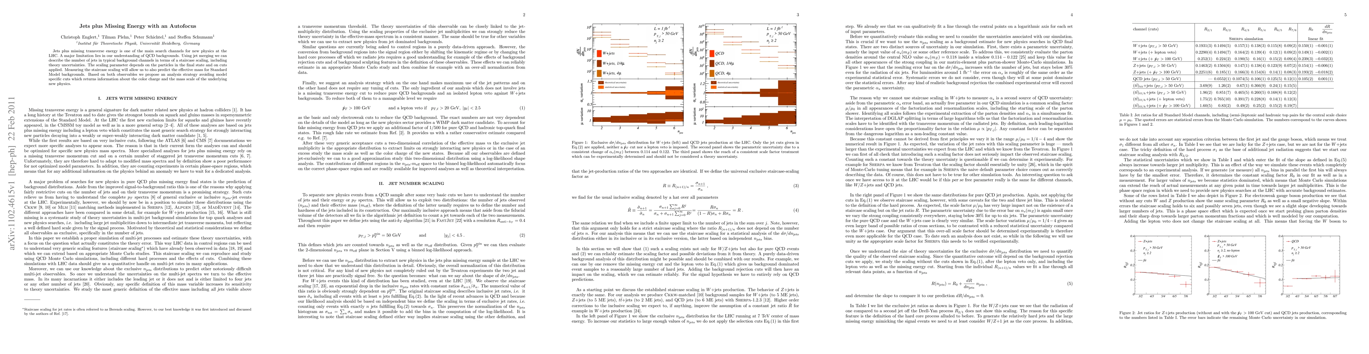 Jets plus missing transverse energy is one of the main search channels for new physics at the LHC. A major limitation lies in our understanding of QCD backgrounds. Using jet merging we can describe the number of jets in typical background channels in terms of a staircase scaling, including theory uncertainties. The scaling parameter depends on the particles in the final state and on cuts applied. Measuring the staircase scaling will allow us to also predict the effective mass for Standard Model backgrounds. Based on both observables we propose an analysis strategy avoiding model specific cuts which returns information about the color charge and the mass scale of the underlying new physics.