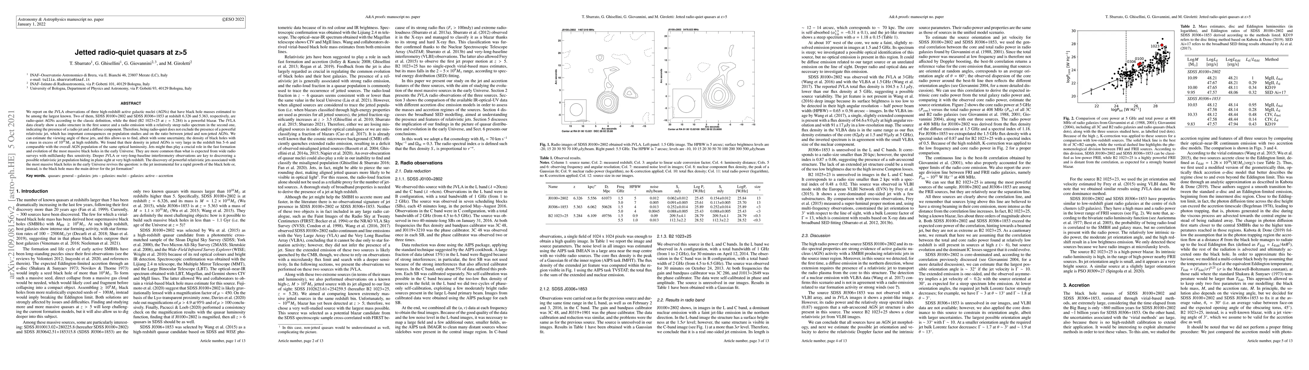 We report on the JVLA observations of three high redshift Active Galactic Nuclei (AGN), having a black hole mass estimated to be among the largest known. Two of them, SDSS J0100+2802 and SDSS J0306+1853 at redshift 6.326 and 5.363 respectively, are radio-quiet AGN according to the classic definition, while the third (B2 1023+25 at z=5.284) is a powerful blazar. The JVLA data clearly show a radio structure in the first source, and a radio emission with a relatively steep radio spectrum in the second one, demonstrating the presence of a radio jet and a diffuse component. Therefore, being radio-quiet does not exclude the presence of a powerful relativistic jet with important consequences on the population studies and on the ratio between jetted and non-jetted AGN. We can estimate the viewing angle of these jets, and this allows us to find, albeit with some uncertainty, the density of black holes with a mass in excess of $10^{10}M_\odot$ at high redshifts. We found that their density in jetted AGN is very large in the redshift bin 5-6, comparable with the overall AGN population of the same optical luminosity. Jets might thus play a crucial role in the fast formation and evolution of the most massive black holes in the early Universe. They are more common than what expected from wide radio surveys with mJy flux sensitivity. Deeper JVLA or VLBI observations are key to discover a possible relativistic jet population hiding in plain sight at very high-redshift. The discovery of powerful relativistic jets associated with the most massive black holes in the early Universe re-opens the question: is the jet instrumental for a rapid growth of the black hole or instead is the black hole mass the main driver for the jet formation?