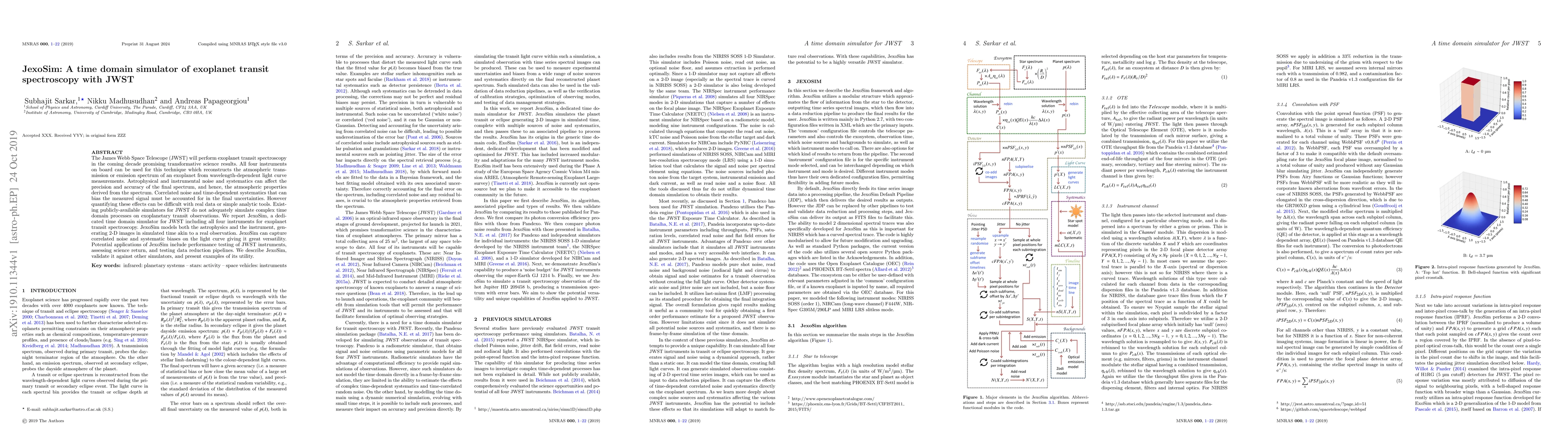 JexoSim is a time domain simulator for exoplanet transit spectroscopy using the JWST, designed to model astrophysical and instrumental noise for all four JWST instruments. It generates realistic 2-D images and captures correlated noise and systematic biases, aiding in performance testing and data reduction pipeline validation.