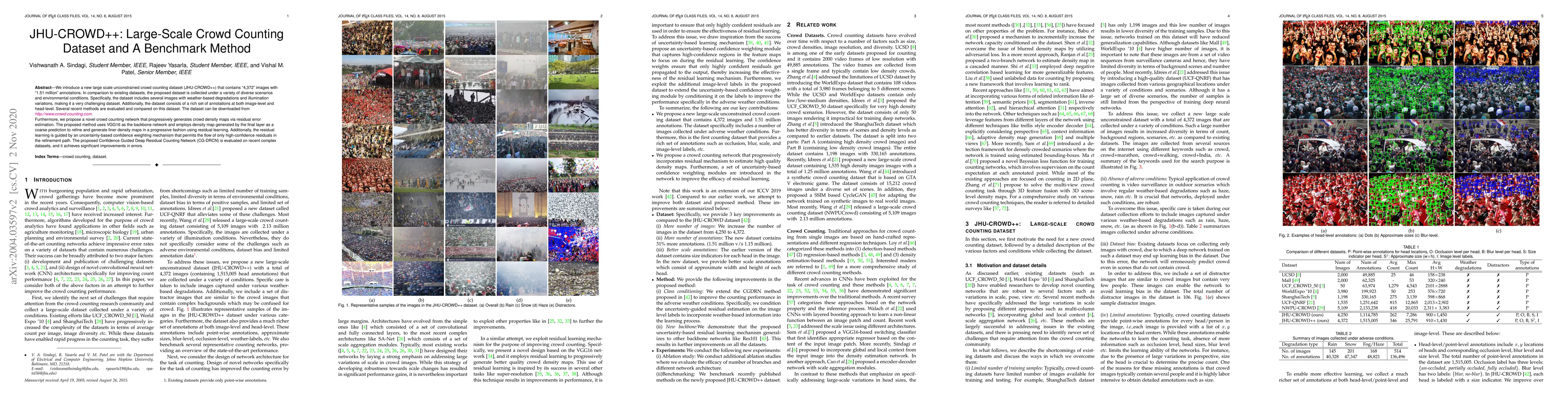 The paper introduces the JHU-CROWD++ dataset, a large-scale crowd counting dataset with 4,372 images and 1.51 million annotations, designed to address diverse real-world scenarios. It also proposes a novel Confidence Guided Deep Residual Counting Network (CG-DRCN) that progressively refines crowd density maps using residual learning and an uncertainty-based weighting mechanism, achieving significant improvements in counting accuracy.