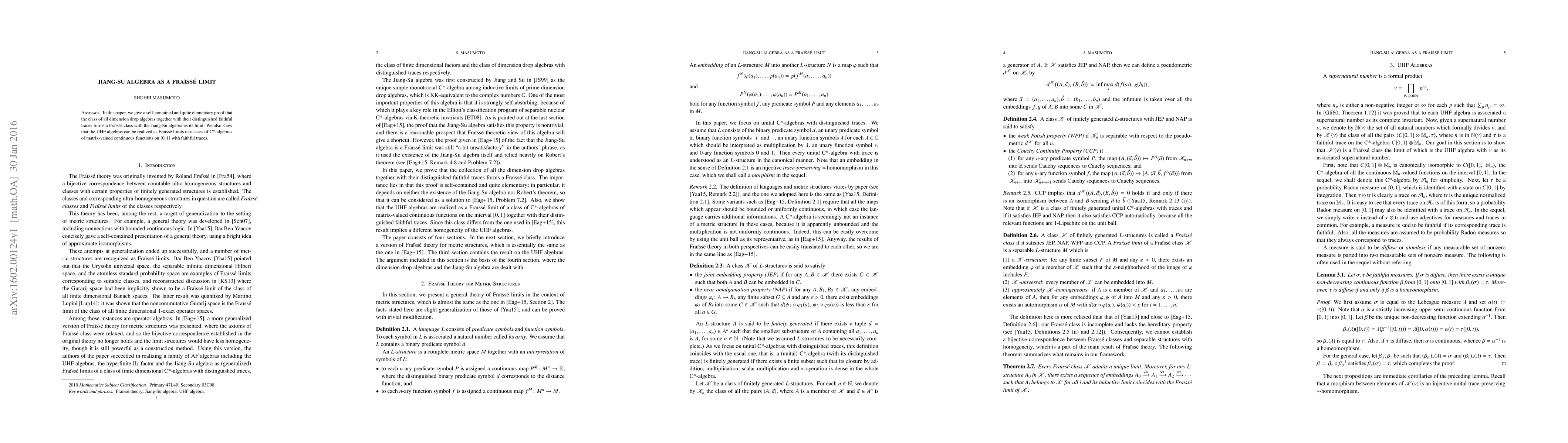 This paper proves that the Jiang-Su algebra emerges as the Fraissé limit of the class of all dimension drop algebras equipped with their faithful traces. Additionally, it demonstrates that UHF algebras can be realized as Fraissé limits of C*-algebras formed by matrix-valued continuous functions on [0, 1] with faithful traces.