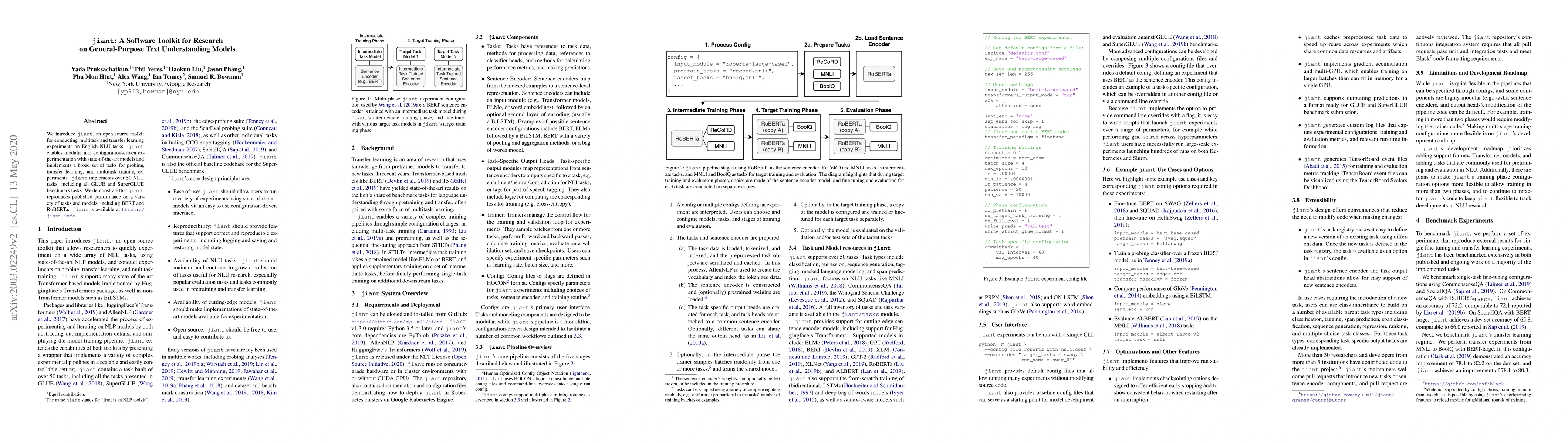 We introduce jiant, an open source toolkit for conducting multitask and transfer learning experiments on English NLU tasks. jiant enables modular and configuration-driven experimentation with state-of-the-art models and implements a broad set of tasks for probing, transfer learning, and multitask training experiments. jiant implements over 50 NLU tasks, including all GLUE and SuperGLUE benchmark tasks. We demonstrate that jiant reproduces published performance on a variety of tasks and models, including BERT and RoBERTa. jiant is available at https://jiant.info.