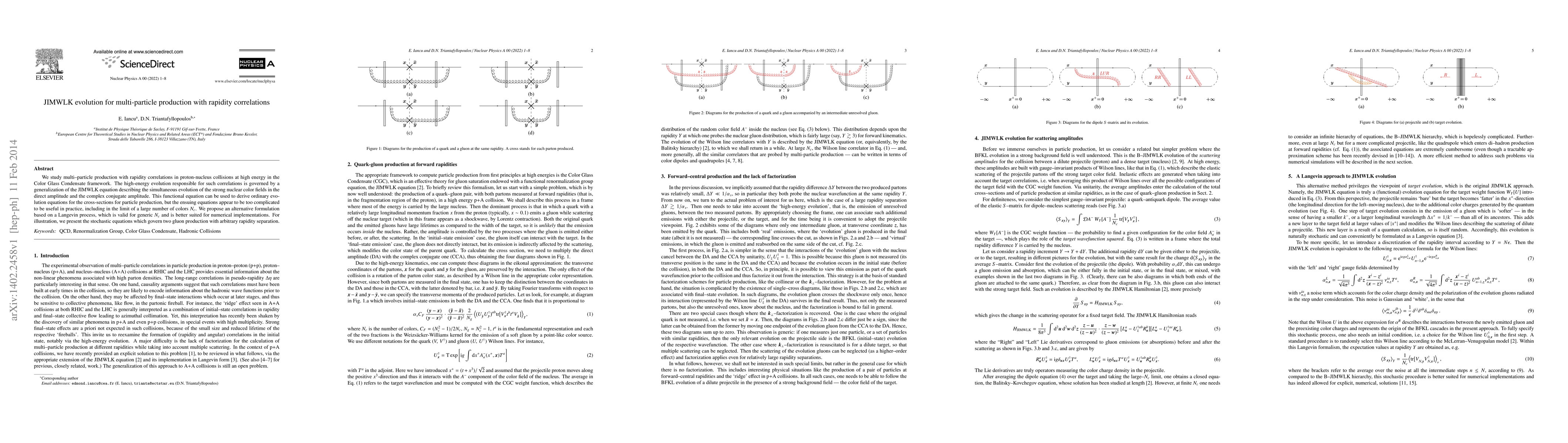 This paper explores multi-particle production in proton-nucleus collisions using the Color Glass Condensate framework, focusing on rapidity correlations. It proposes a Langevin process alternative to the JIMWLK equation for practical evolution of strong nuclear color fields, demonstrating its application through stochastic equations for two gluon production.