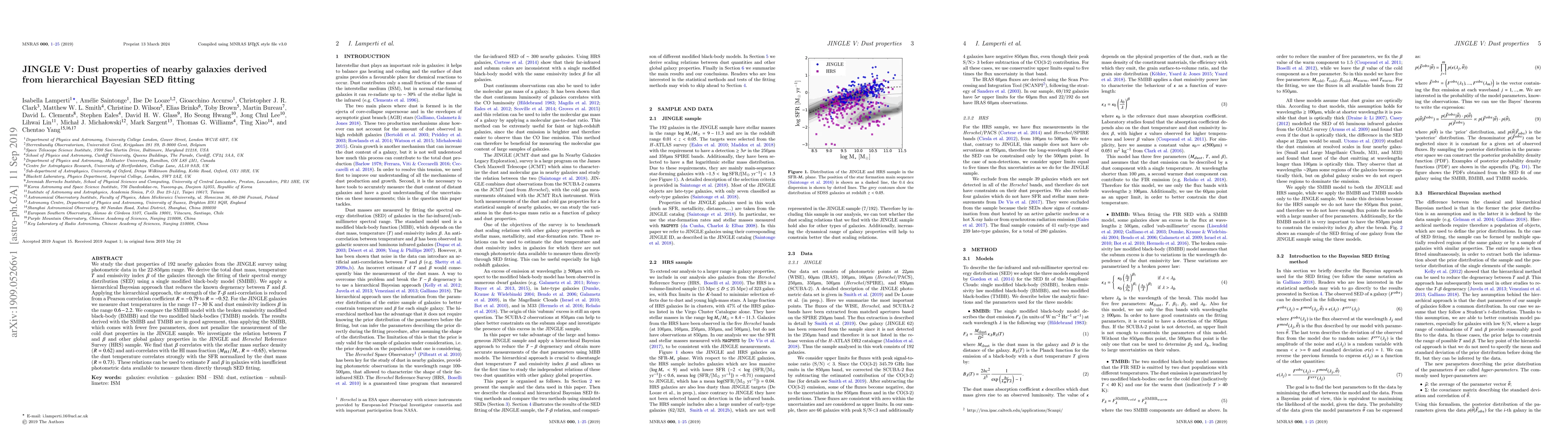 This study uses hierarchical Bayesian SED fitting to determine dust properties in 192 nearby galaxies from the JINGLE survey, finding dust temperatures between 17-30 K and emissivity indices 0.6-2.2. The approach reduces the T-beta anti-correlation, revealing correlations between beta and stellar mass surface density, and between dust temperature and the SFR normalized by dust mass.