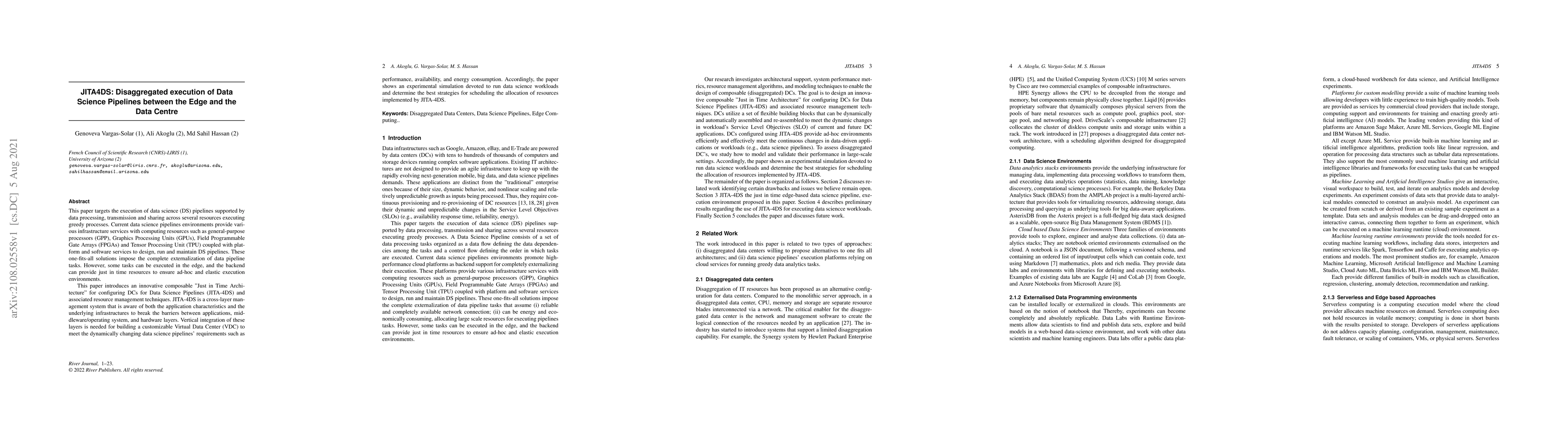 This paper proposes JITA4DS, a composable architecture for dynamically configuring data science pipelines across edge and data center resources, optimizing performance and resource allocation. The system integrates application characteristics with infrastructure to create a customizable Virtual Data Center, validated through experimental simulations.