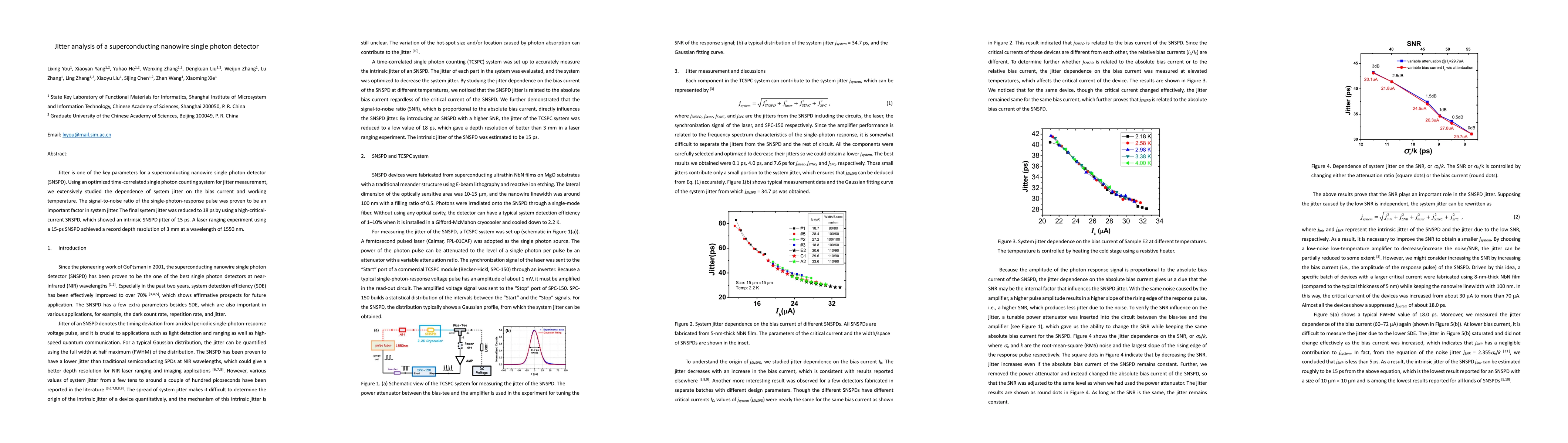 This paper investigates the jitter in a superconducting nanowire single photon detector (SNSPD), finding that it depends on bias current and temperature, with the signal-to-noise ratio also playing a crucial role. The optimized system achieved a final jitter of 18 ps, leading to a laser ranging experiment that attained a depth resolution of 3 mm at 1550 nm.