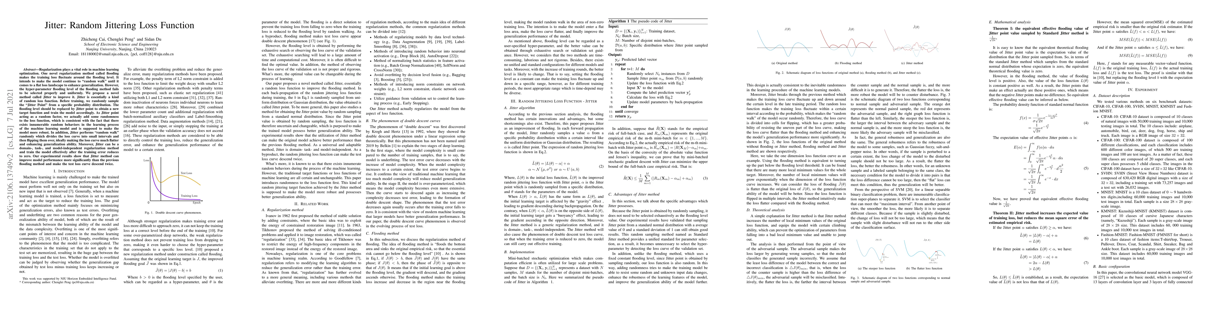 Regularization plays a vital role in machine learning optimization. One novel regularization method called flooding makes the training loss fluctuate around the flooding level. It intends to make the model continue to random walk until it comes to a flat loss landscape to enhance generalization. However, the hyper-parameter flooding level of the flooding method fails to be selected properly and uniformly. We propose a novel method called Jitter to improve it. Jitter is essentially a kind of random loss function. Before training, we randomly sample the Jitter Point from a specific probability distribution. The flooding level should be replaced by Jitter point to obtain a new target function and train the model accordingly. As Jitter point acting as a random factor, we actually add some randomness to the loss function, which is consistent with the fact that there exists innumerable random behaviors in the learning process of the machine learning model and is supposed to make the model more robust. In addition, Jitter performs random walk randomly which divides the loss curve into small intervals and then flipping them over, ideally making the loss curve much flatter and enhancing generalization ability. Moreover, Jitter can be a domain-, task-, and model-independent regularization method and train the model effectively after the training error reduces to zero. Our experimental results show that Jitter method can improve model performance more significantly than the previous flooding method and make the test loss curve descend twice.