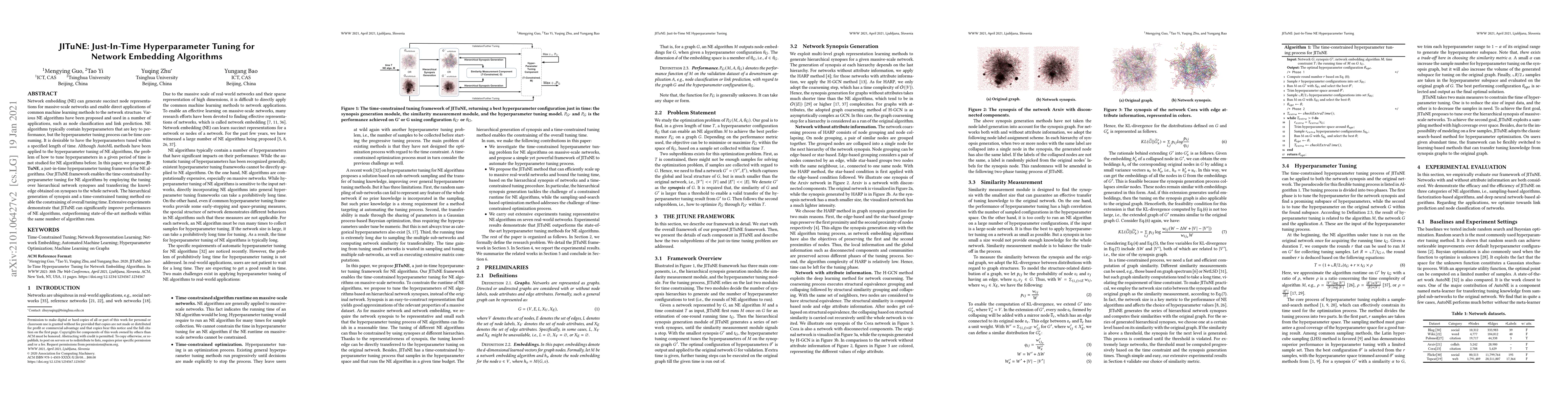 JITuNE introduces a just-in-time hyperparameter tuning framework for network embedding algorithms, enabling efficient tuning within specified time limits through hierarchical network synopses and knowledge transfer. Experiments show JITuNE significantly enhances performance compared to state-of-the-art methods.