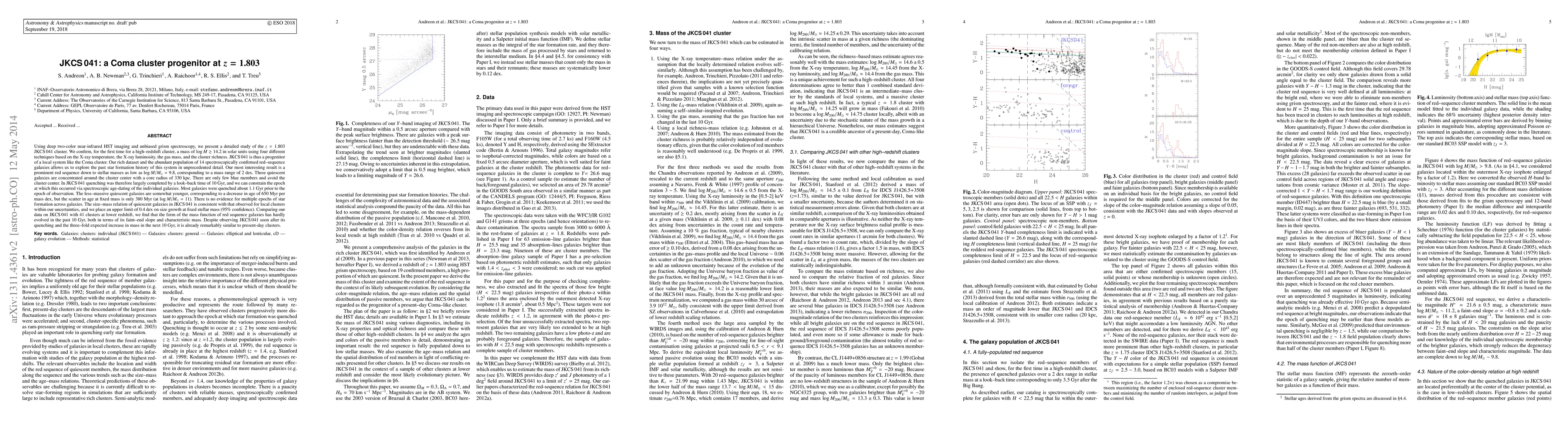 JKCS041, a high-redshift cluster at z=1.803, is identified as a progenitor of local clusters like Coma, with a confirmed mass of $\log M=14.2$ using multiple techniques. The cluster shows a prominent red sequence of quenched galaxies, indicating that most star formation ceased 1.1 Gyr before observation, with less massive galaxies quenched slightly later.