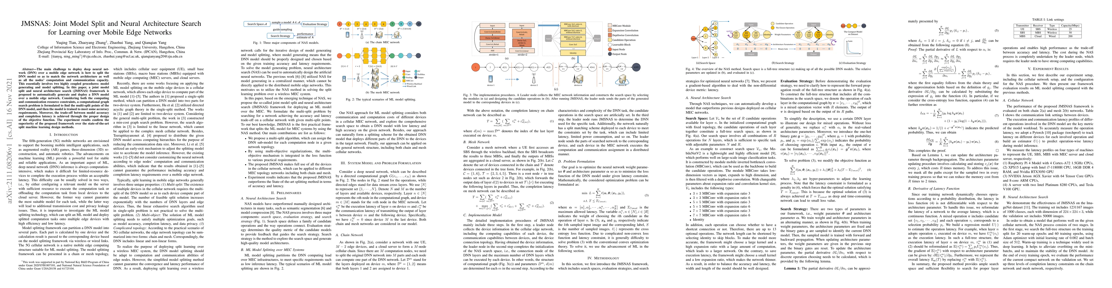 The JMSNAS framework proposes a method for jointly generating and splitting deep neural network models to optimize deployment over mobile edge networks, balancing computation and communication constraints. Experimental results show its effectiveness in achieving a trade-off between model accuracy and latency compared to existing methods.