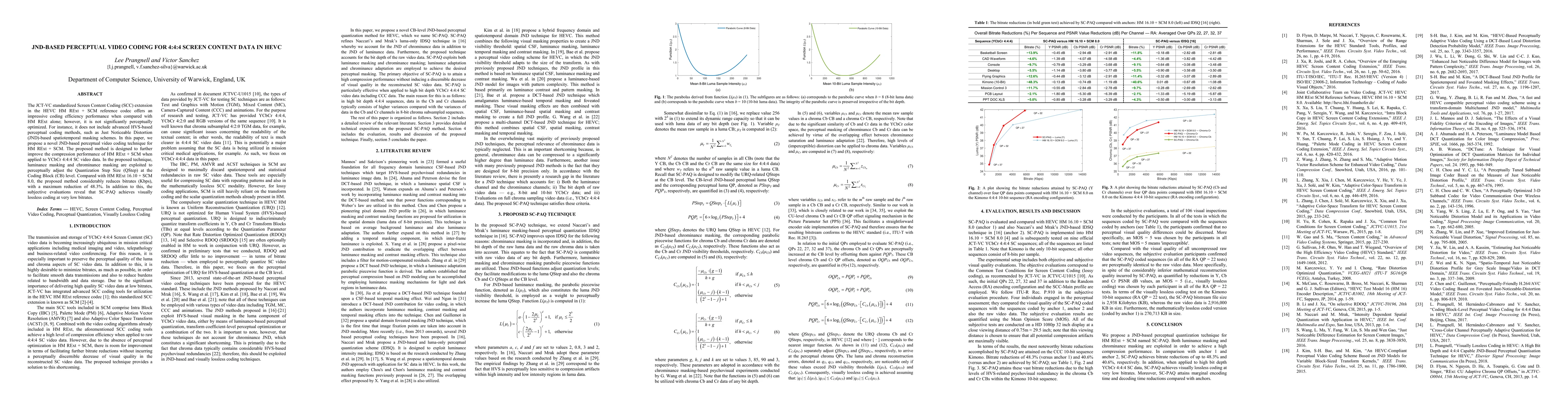 This paper proposes a JND-based perceptual video coding technique for HEVC's Screen Content Coding extension, aiming to enhance compression efficiency for 4:4:4 YCbCr video data. The method reduces bitrates by up to 48.3% while maintaining visually lossless quality, leveraging luminance and chrominance masking to adjust Quantization Step Size.