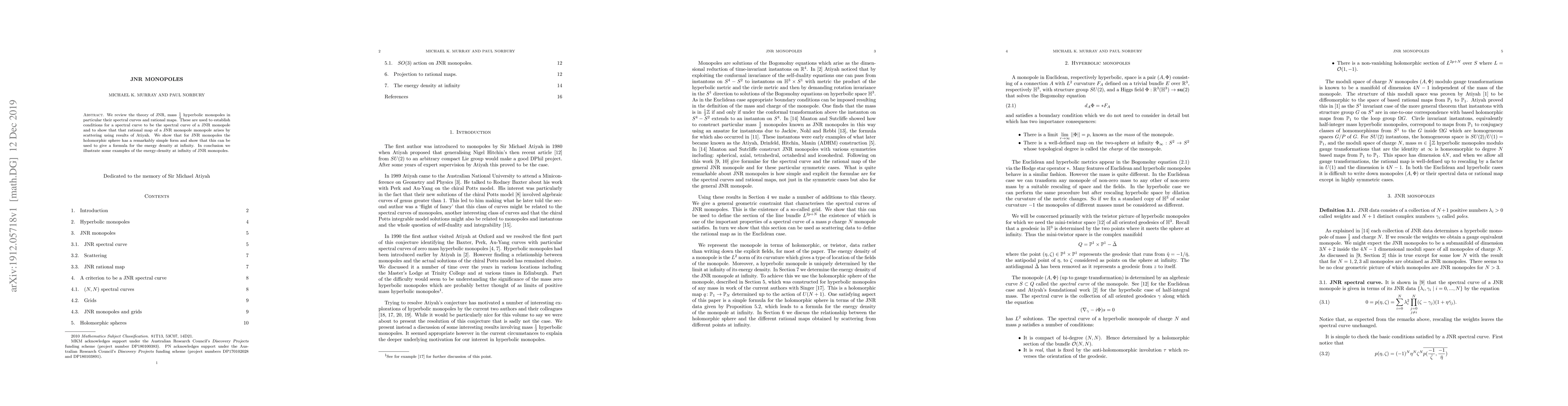 This paper reviews the theory of JNR monopoles, focusing on their spectral curves and rational maps, and establishes conditions for spectral curves of these monopoles. It demonstrates how the holomorphic sphere has a simple form, which is used to derive a formula for the energy density at infinity, concluding with illustrative examples.