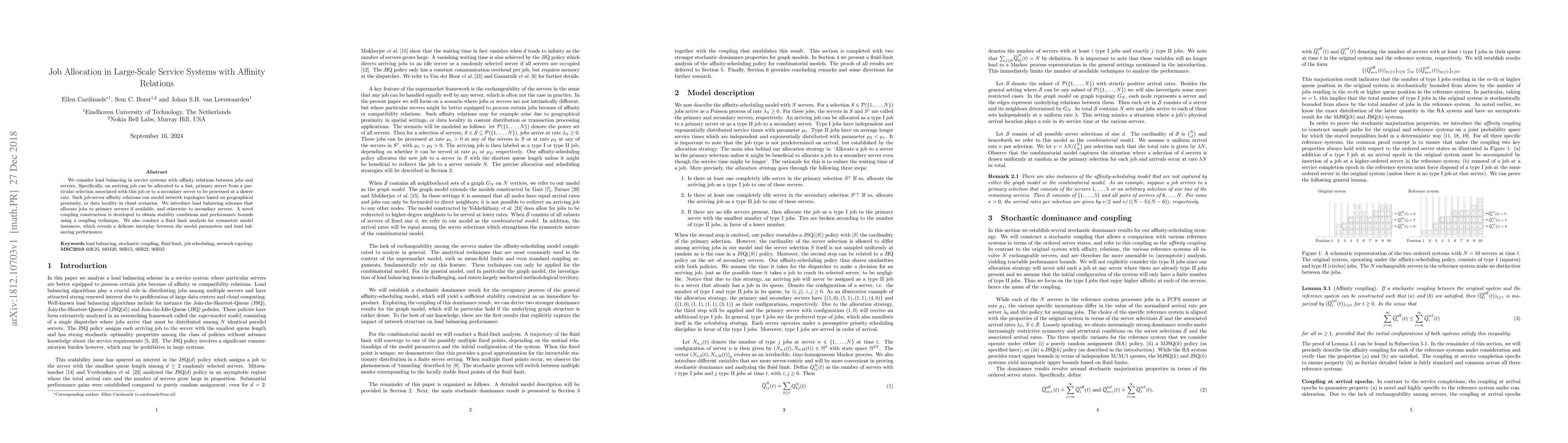 We consider load balancing in service systems with affinity relations between jobs and servers. Specifically, an arriving job can be allocated to a fast, primary server from a particular selection associated with this job or to a secondary server to be processed at a slower rate. Such job-server affinity relations can model network topologies based on geographical proximity, or data locality in cloud scenarios. We introduce load balancing schemes that allocate jobs to primary servers if available, and otherwise to secondary servers. A novel coupling construction is developed to obtain stability conditions and performance bounds using a coupling technique. We also conduct a fluid limit analysis for symmetric model instances, which reveals a delicate interplay between the model parameters and load balancing performance.
