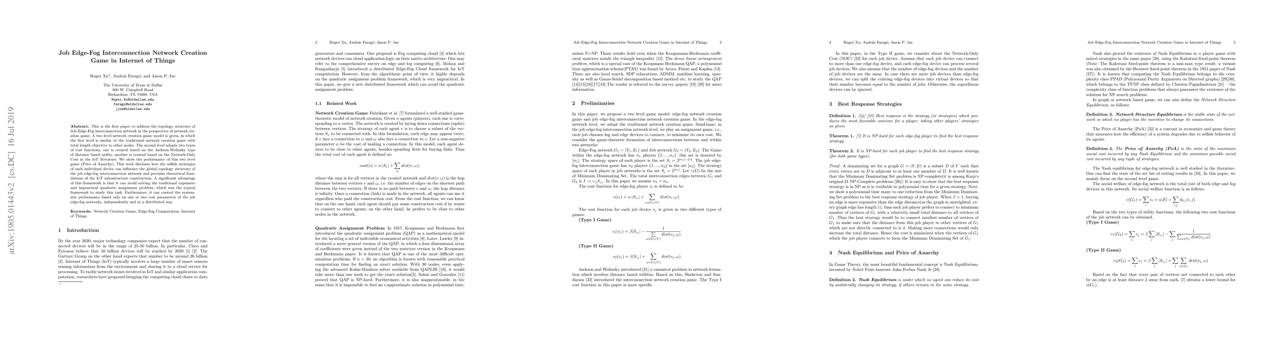 This paper introduces a two-level network creation game model to study the topology structure of Job Edge-Fog interconnection networks in IoT, providing theoretical foundations for infrastructure construction.