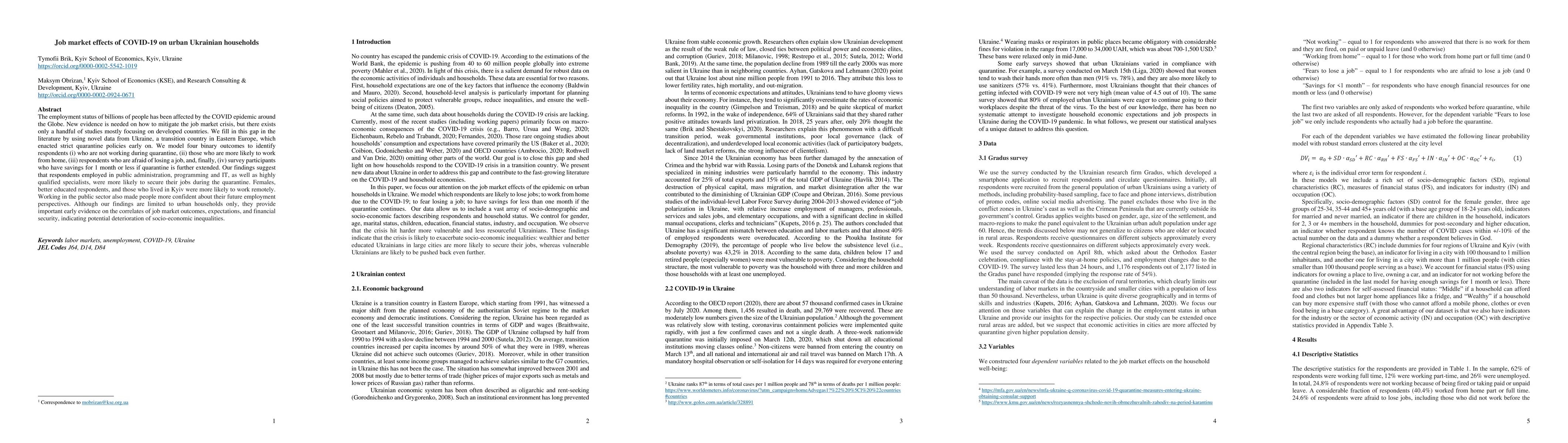 The employment status of billions of people has been affected by the COVID epidemic around the Globe. New evidence is needed on how to mitigate the job market crisis, but there exists only a handful of studies mostly focusing on developed countries. We fill in this gap in the literature by using novel data from Ukraine, a transition country in Eastern Europe, which enacted strict quarantine policies early on. We model four binary outcomes to identify respondents (i) who are not working during quarantine, (ii) those who are more likely to work from home, (iii) respondents who are afraid of losing a job, and, finally, (iv) survey participants who have savings for 1 month or less if quarantine is further extended. Our findings suggest that respondents employed in public administration, programming and IT, as well as highly qualified specialists, were more likely to secure their jobs during the quarantine. Females, better educated respondents, and those who lived in Kyiv were more likely to work remotely. Working in the public sector also made people more confident about their future employment perspectives. Although our findings are limited to urban households only, they provide important early evidence on the correlates of job market outcomes, expectations, and financial security, indicating potential deterioration of socio-economic inequalities.