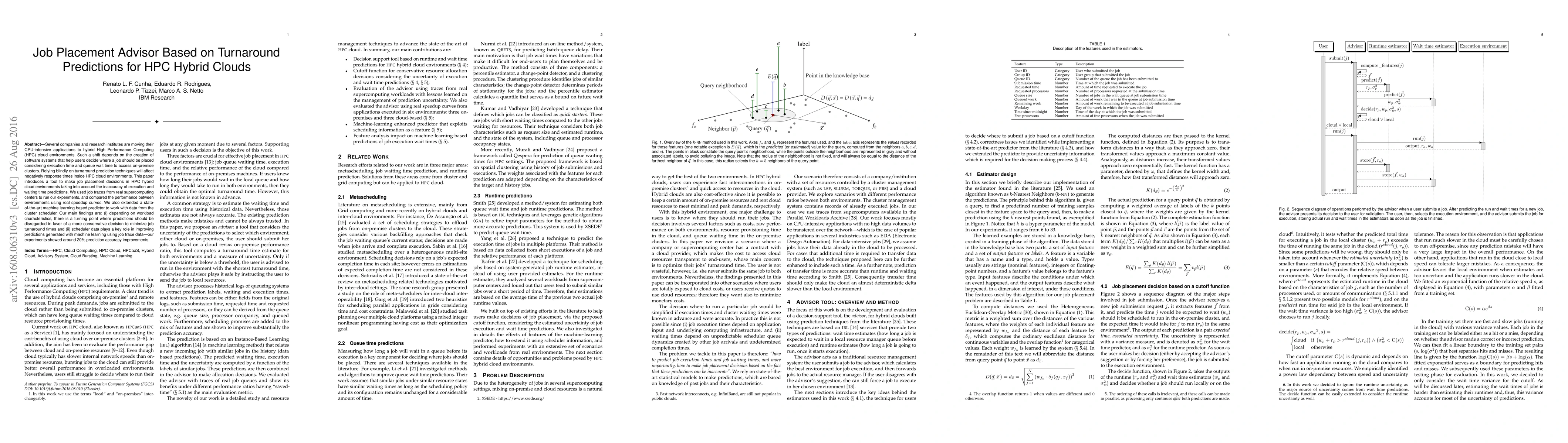 Several companies and research institutes are moving their CPU-intensive applications to hybrid High Performance Computing (HPC) cloud environments. Such a shift depends on the creation of software systems that help users decide where a job should be placed considering execution time and queue wait time to access on-premise clusters. Relying blindly on turnaround prediction techniques will affect negatively response times inside HPC cloud environments. This paper introduces a tool to make job placement decisions in HPC hybrid cloud environments taking into account the inaccuracy of execution and waiting time predictions. We used job traces from real supercomputing centers to run our experiments, and compared the performance between environments using real speedup curves. We also extended a state-of-the-art machine learning based predictor to work with data from the cluster scheduler. Our main findings are: (i) depending on workload characteristics, there is a turning point where predictions should be disregarded in favor of a more conservative decision to minimize job turnaround times and (ii) scheduler data plays a key role in improving predictions generated with machine learning using job trace data---our experiments showed around 20% prediction accuracy improvements.